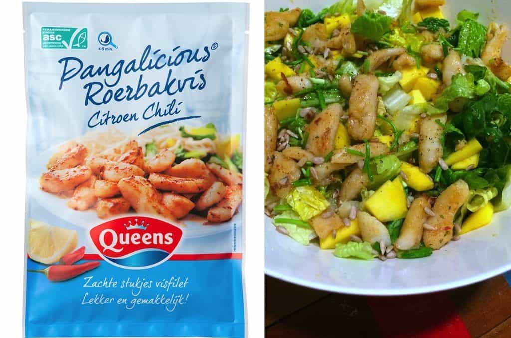 Met panga is inderdaad niet-zoveel-mis, zoals Mac het al omschreef in zijn artikel. Als je maar weet waar het vandaan komt. Laten we wel eerlijk wezen dat panga qua smaak, geur en textuur de meest milde visvorm is. Ik ben een echte visliefhebber en vind panga weinig uitdagen. Maar voor grote groepen mensen en kinderen is het een ideale vis. Je kunt er makkelijk mee (roer)bakken en het is snel klaar. Zo maakte ik er een salade mee met mango, heerlijk als zomerse lunch. Het recept vind je hieronder. Inmiddels staat er een zak panga bij ons in de diepvries. Op een drukke doordeweekse dag bak ik een stukje met wat worteltjes of spinazie en salade. Zo eten we gezond, lekker en snel. Wie had dat ooit gedacht een paar maanden geleden.