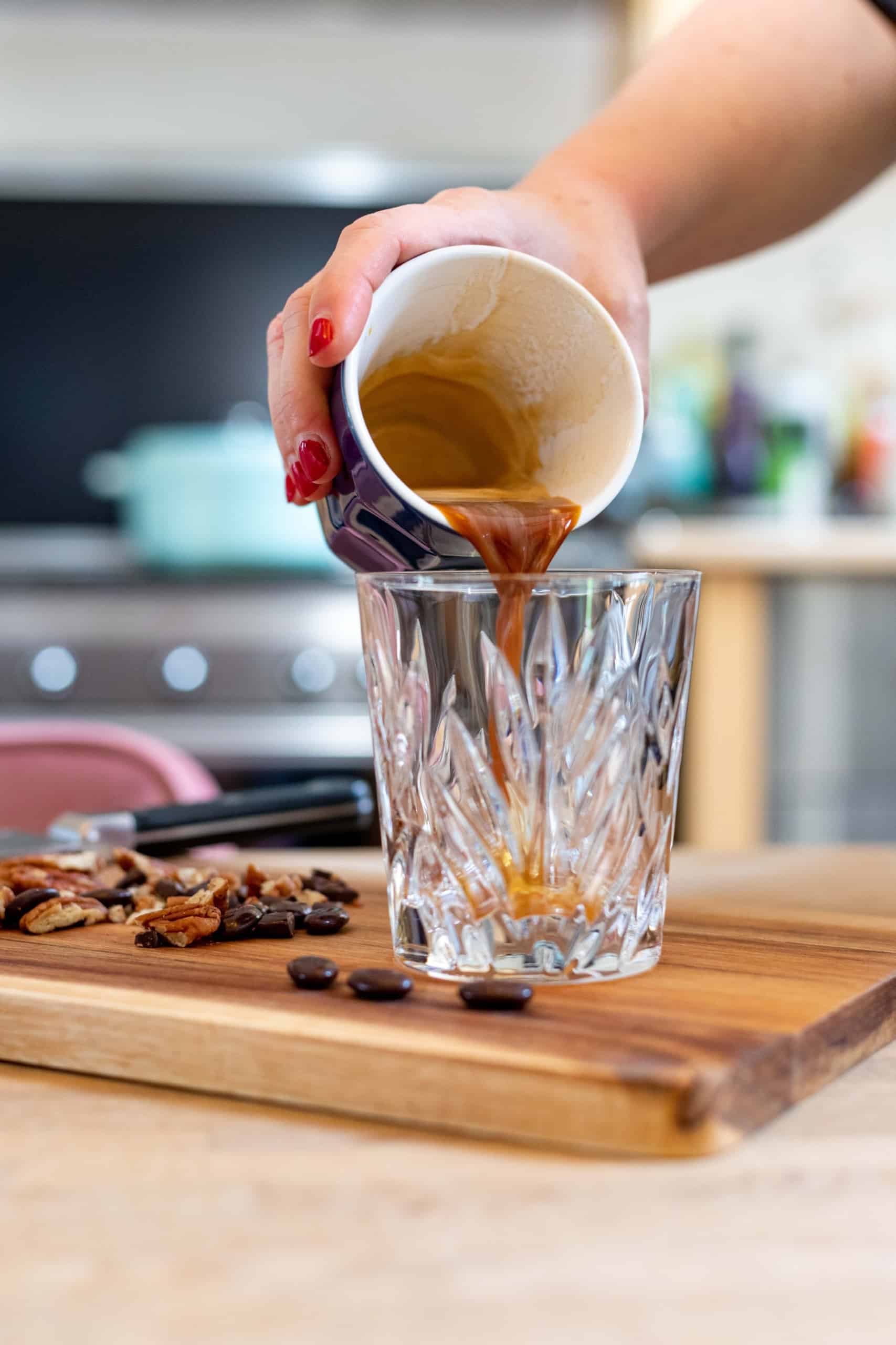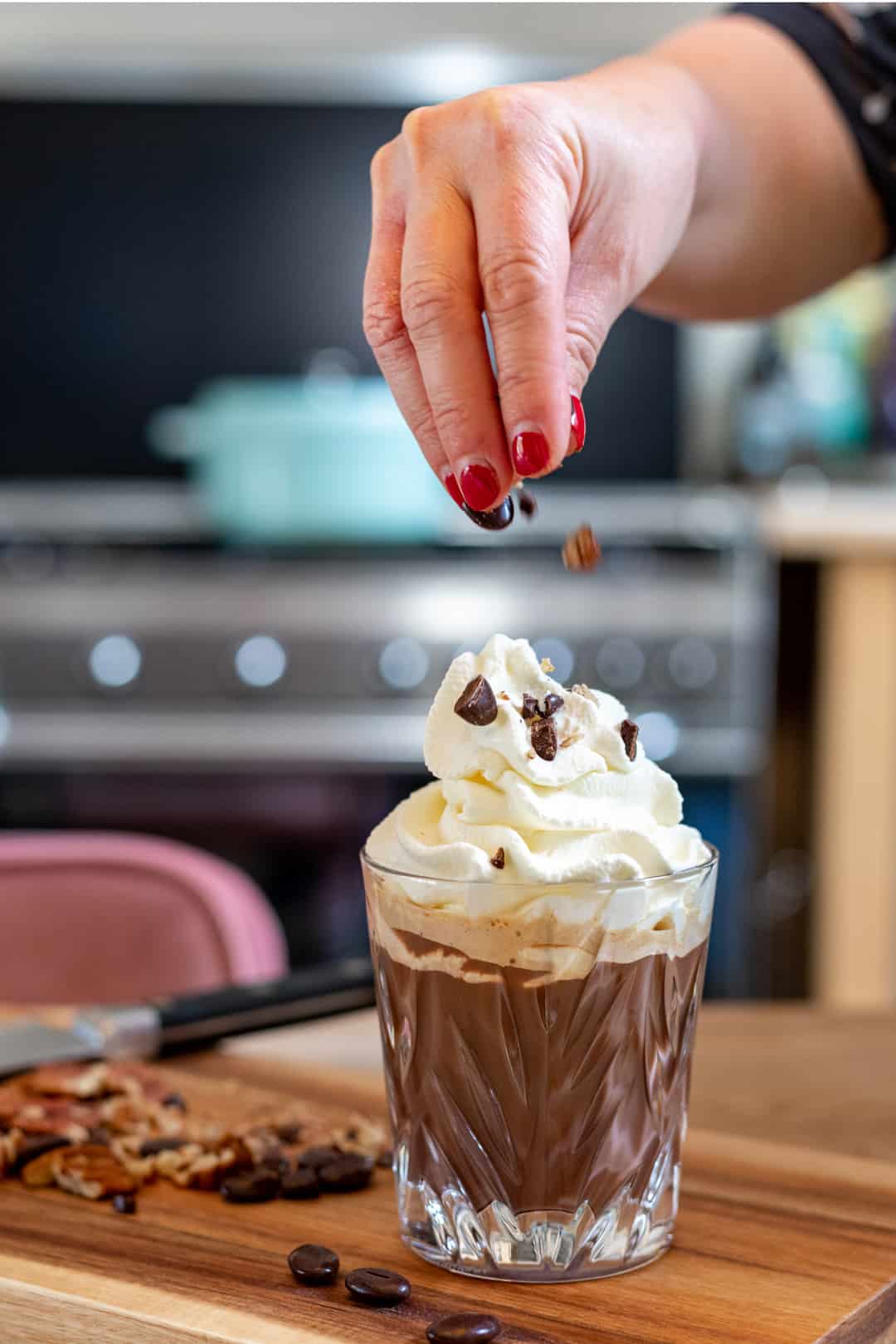 - topping: 1 el pecannoten + mokkaboontjes, of stukje pure chocolade, fijngehakt