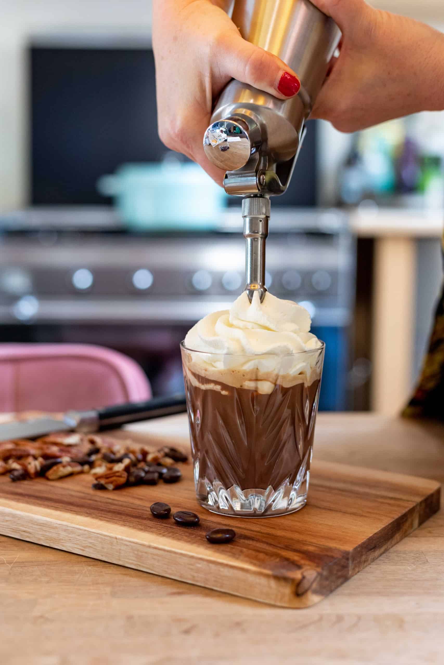 - Garneer met de opgeklopte slagroom en strooi daarop de fijngehakte pecannoten met mokkaboontjes of pure chocolade. Serveer direct.