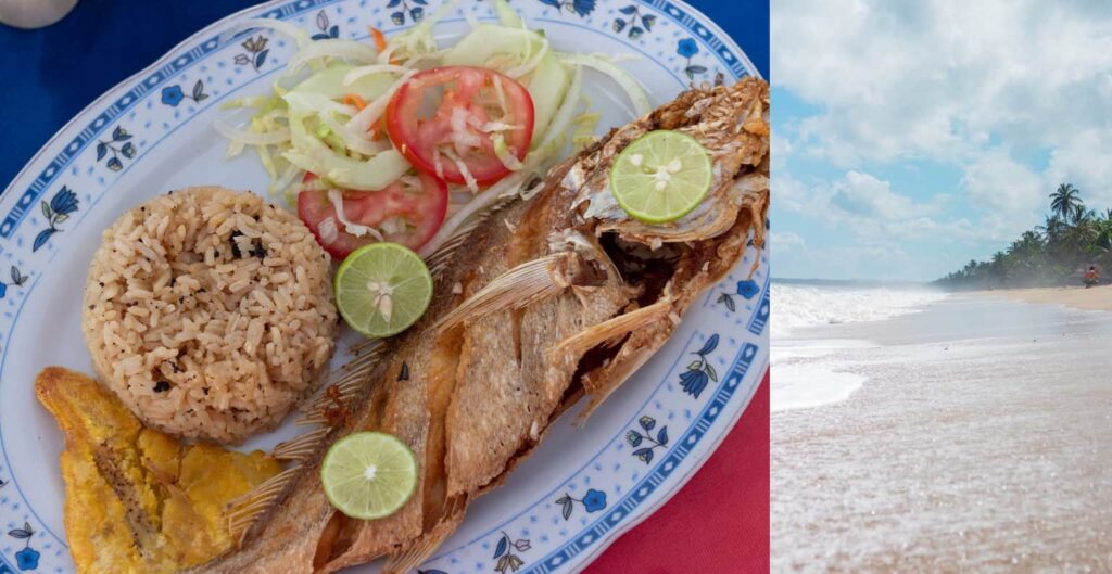 Je zit met je tenen in ’t zand en plakt met je billen vast aan een plastic stoeltje. Hoort op de achtergrond de zee beuken (in Palomino staat zo’n heftige stroming dat ruizen er niks bij is) en je koude biertje smaakt het best bij een gefrituurd visje. Met waanzinnig lekkere kokosrijst en voorruit ook die bakbanaan smaakt prima. Dit gerecht is in elke kustplaats te krijgen en een fijne safe optie in Colombia.