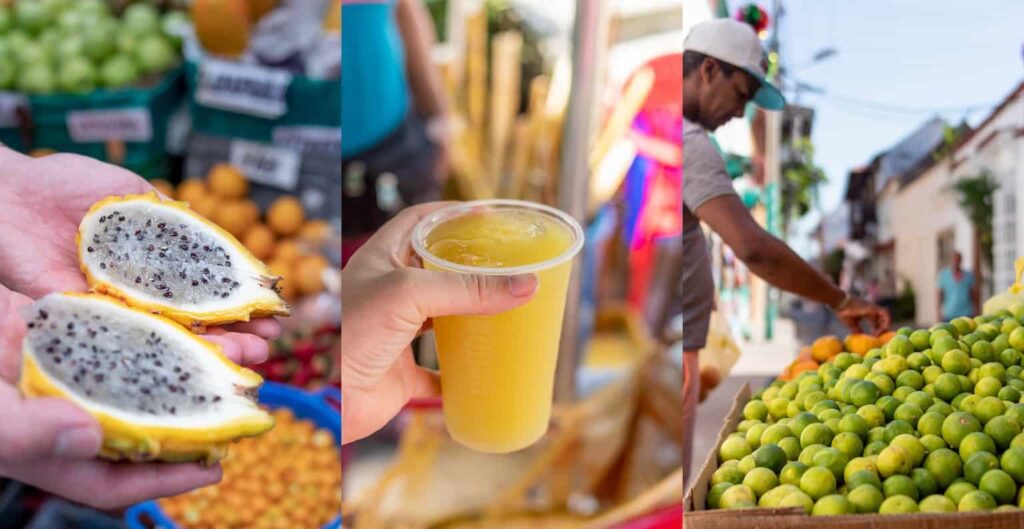 Aan groente en fruit geen gebrek in Colombia en dus krijg je naast eieren ook standaard een berg fruit of sapje bij je ontbijt. Heerlijk! Ook handig om mee te nemen op reis en zo altijd wat te eten te hebben onderweg of bij aankomst. Dragonfruit & Guarapo (sap van suikerriet) zijn mijn absolute favoriet. En mocht je de kans krijgen om de cacaovrucht te proeven dan is dat echt een must. Die is hartstikke zoet. In Bonda ging ik naar een cacaoplantage en dat was een feestje op zich.