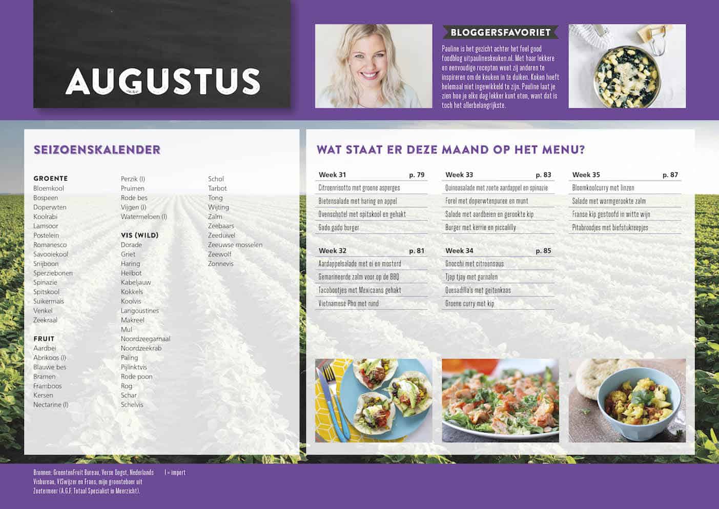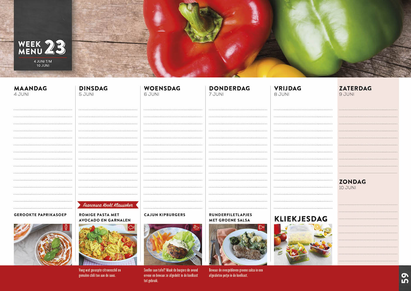 Natuurlijk vind je er ook weer de vaste kliekjesdag op vrijdag in zodat je zo min mogelijk hoeft weg te gooien en dus ook lief bent voor je portemonnee. Achterin de kalender vind je makkelijke basisrecepten voor bijgerechten, de handige receptenindex en een notitiepagina.