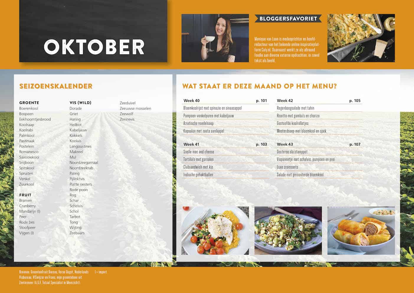 Vis-, vlees- en vegagerechten wisselen elkaar af, met tussendoor leuke tips en extra informatie, bijvoorbeeld over seizoensgroenten. Nieuw dit jaar is de maandelijkse Francesca Kookt Klassieker met een van de succesrecepten van de blog én iedere maand staat er ook een recept in van een van onze favoriete Nederlandse (food)bloggers. Super blij zijn we met de medewerking van Brenda Kookt, Italiaans koken met Antoinette, Club van Relaxte Moeders, Smulpaapje, Koken met Karin, Deb’s Bakery & Kitchen, Oh My Foodness, Uit Pauline’s Keuken, Made by Ellen, Monique van Culy, Liefde voor Lekkers en setje Jelmer de Boer & Jenny Alvares die hun favoriete gerecht hebben aangeleverd. Thanks lieve allemaal!