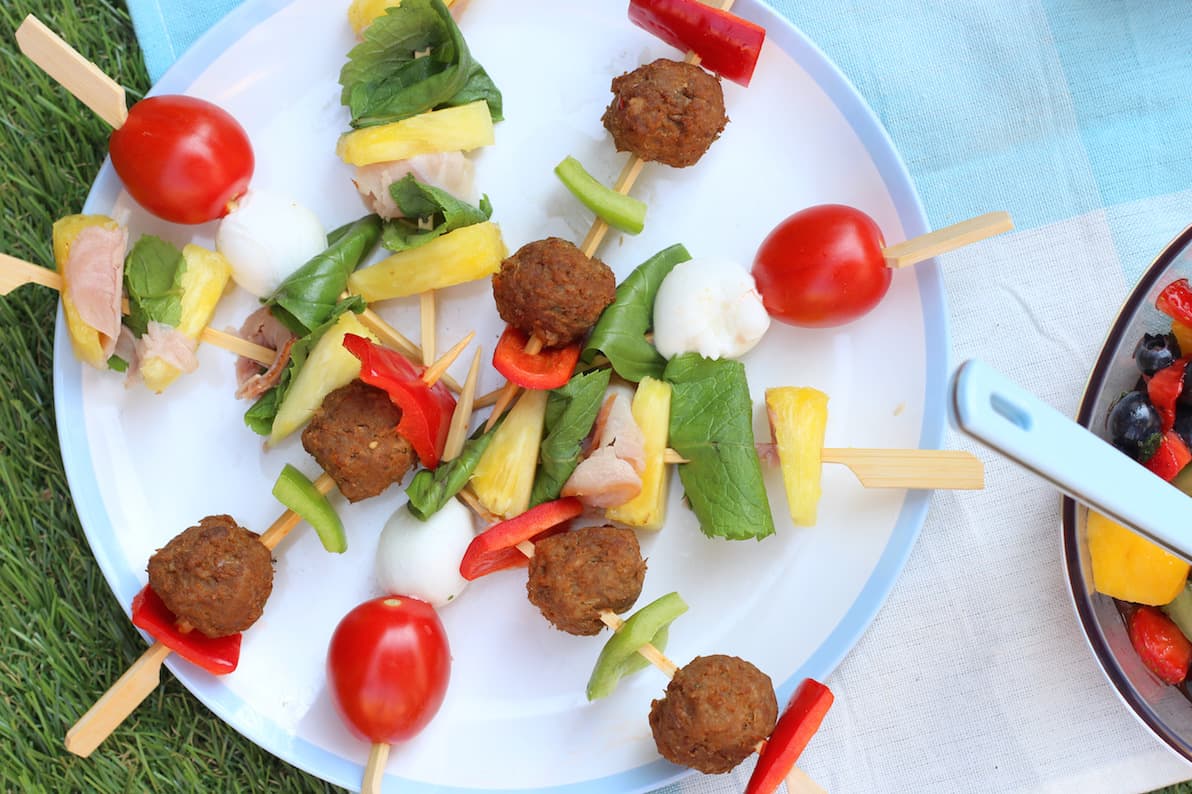 Een van mijn andere favoriete picknick recepten zijn spiesjes, je kunt ze van tevoren al rijgen en op de plaats van bestemming hoef je ze alleen nog maar af te happen. We maakten drie varianten: een klassieke caprese spies, een hawaï spies en een gehaktballetjes spies. Maar laat natuurlijk vooral ook je eigen creativiteit de vrije loop!