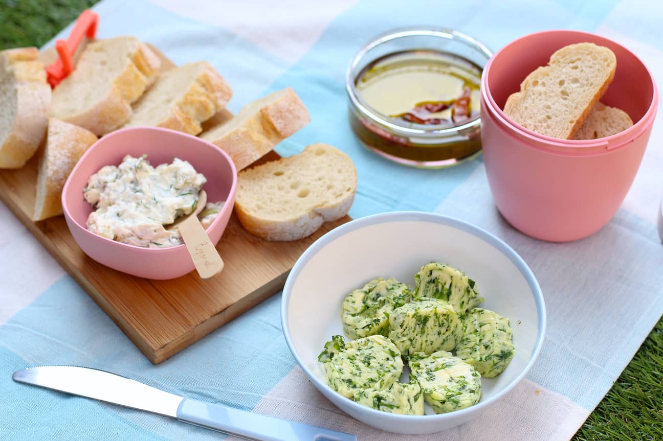 Wat zeker niet mag ontbreken tijdens een picknick is een heerlijk vers stokbrood met allerlei dips en smeersels erbij. Dat maakt het meteen gezellig. Het lekkerste en helemaal niet zo ingewikkeld is toch wel als je de smeersels zelf maakt. Zo maakten wij zelf kruidenboter, roomkaas met dille en augurk en olijfoliedipjes.