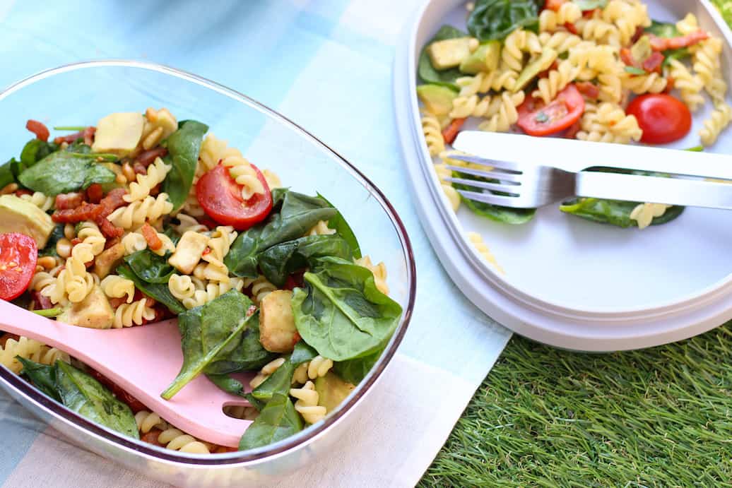 Een pastasalade vinden we een van de ultieme picknickgerechten, want die kun je van tevoren al bereiden, wordt koud geserveerd, is makkelijk mee te nemen en is bovenal natuurlijk heel erg lekker. En deze variant met spinazie, avocado, tomaat en spekjes al helemaal!