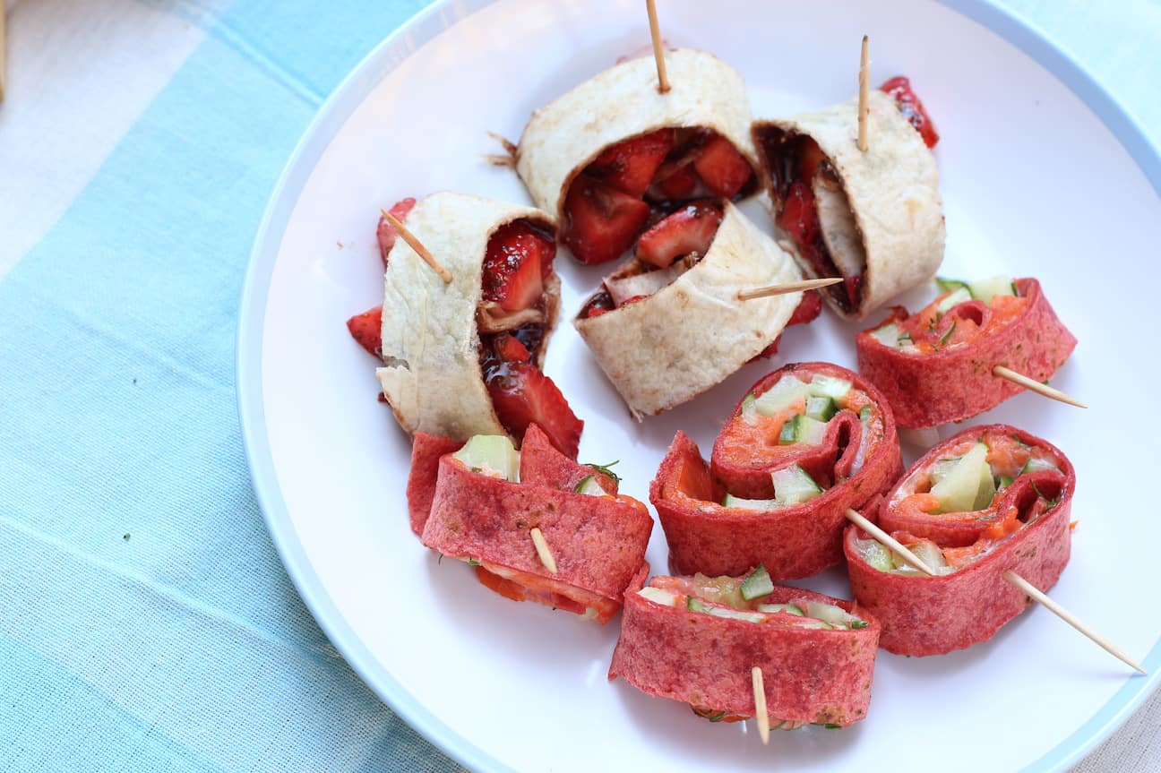 - De nutellawraps met aardbei: was de aardbeien, verwijder de kroontjes en snijd ze in vieren, besmeer de wraps met een dun laagje nutella, verdeel de aardbeien erover en rol strak op. Snijd in plakjes en serveer met prikkertjes.