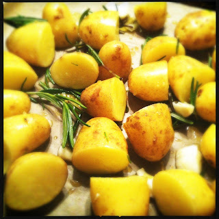Zorg dat de aardappeltjes schoon zijn en snijd ze in tweeën. Neem een bakblik en bekleed deze met bakpapier. Leg hier de aardappeltjes op en strooi hier het grove zeezout, de rozemarijnblaadjes, gehakt teentje knoflook en olijfolie over. Meng dit goed door de aardappeltjes met je handen.