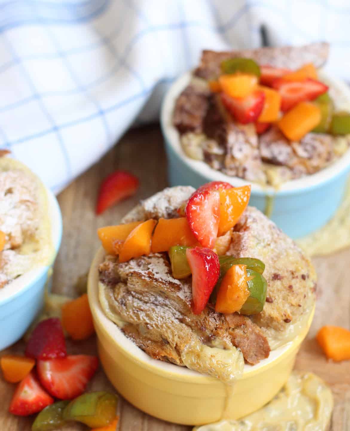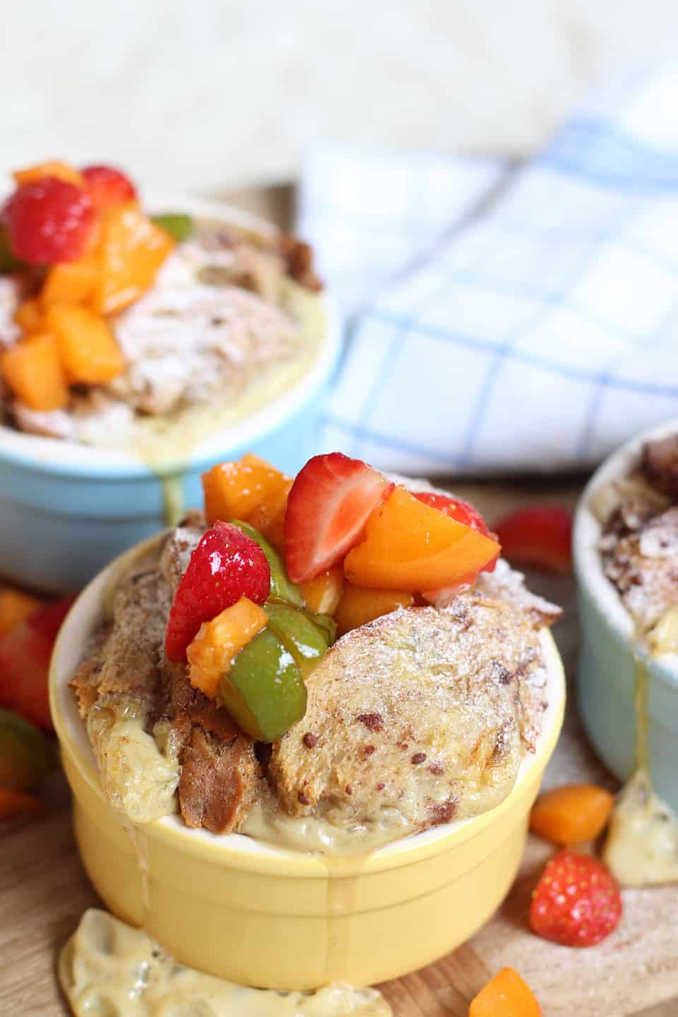 - Zet de schaaltjes op een bordje, garneer met fruit en poedersuiker en serveer nog warm.