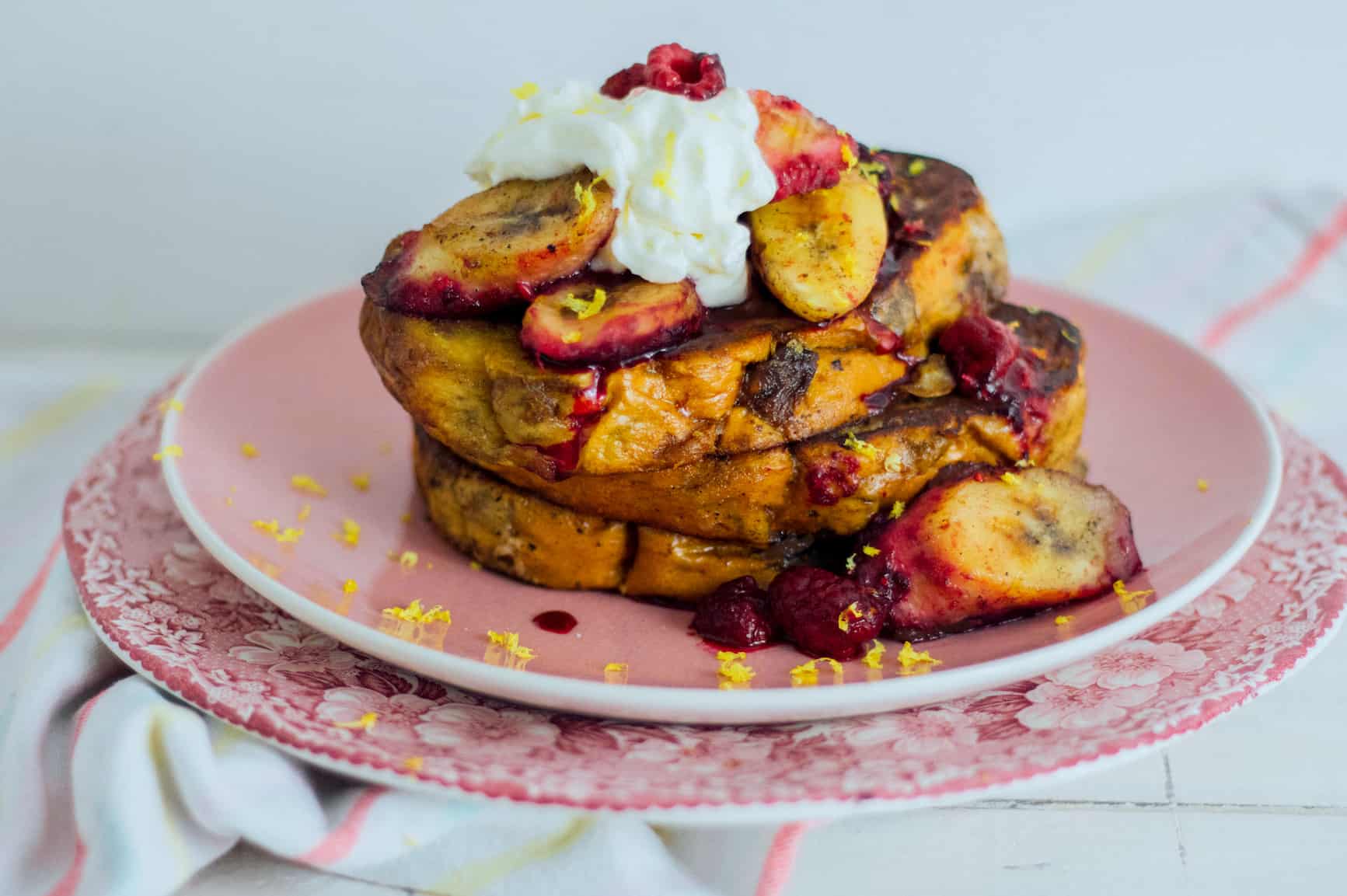 Het mooie is trouwens ook dat je met dit ontbijt perfect restjes kunt opmaken. Ik ken bijna niemand die niet teveel eten in huis heeft rond de feestdagen en ik vind het zelf ontzettend zonde om iets weg te gooien. Daarom verzin ik er dan maar een recept mee. In ieder geval is dit, met of zonder restjes, een waanzinnig lekker ontbijtje! Dus duik de keuken in en verras iedereen met deze wentelteefjes van kerststol met banaan, frambozen en citroenroom!