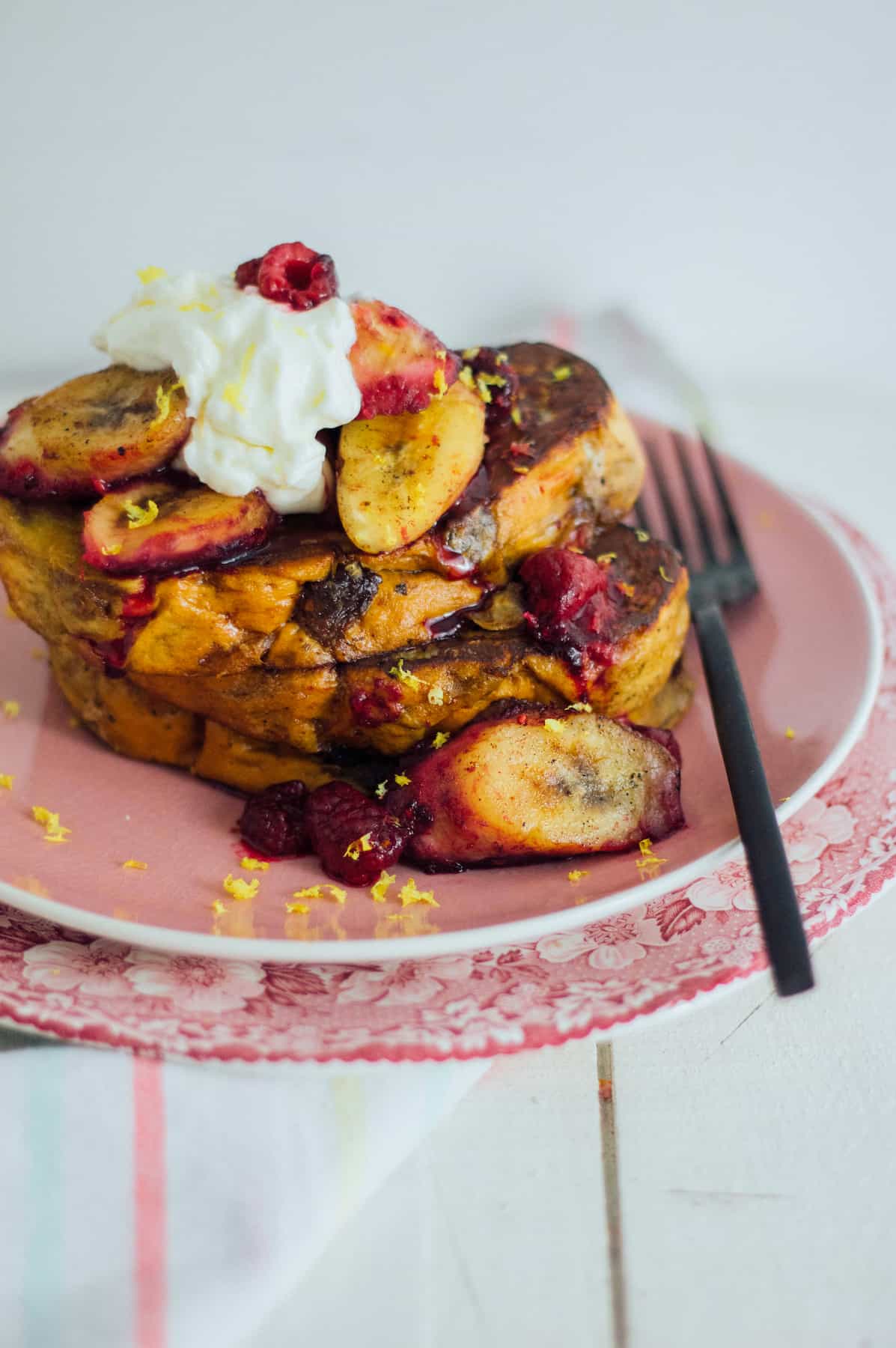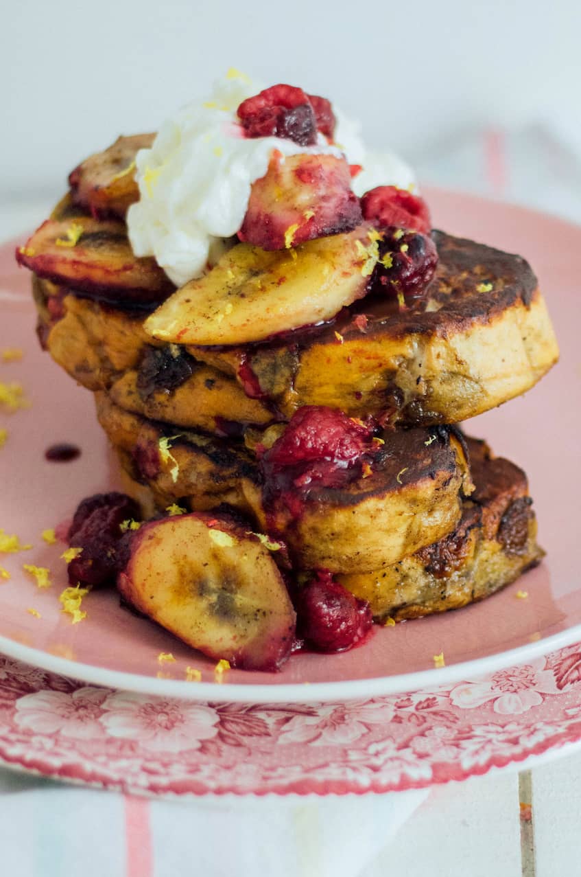 Het mooie is trouwens ook dat je met dit ontbijt perfect restjes kunt opmaken. Ik ken bijna niemand die niet teveel eten in huis heeft rond de feestdagen en ik vind het zelf ontzettend zonde om iets weg te gooien. Daarom verzin ik er dan maar een recept mee. In ieder geval is dit, met of zonder restjes, een waanzinnig lekker ontbijtje! Dus duik de keuken in en verras iedereen met deze wentelteefjes van kerststol met banaan, frambozen en citroenroom!