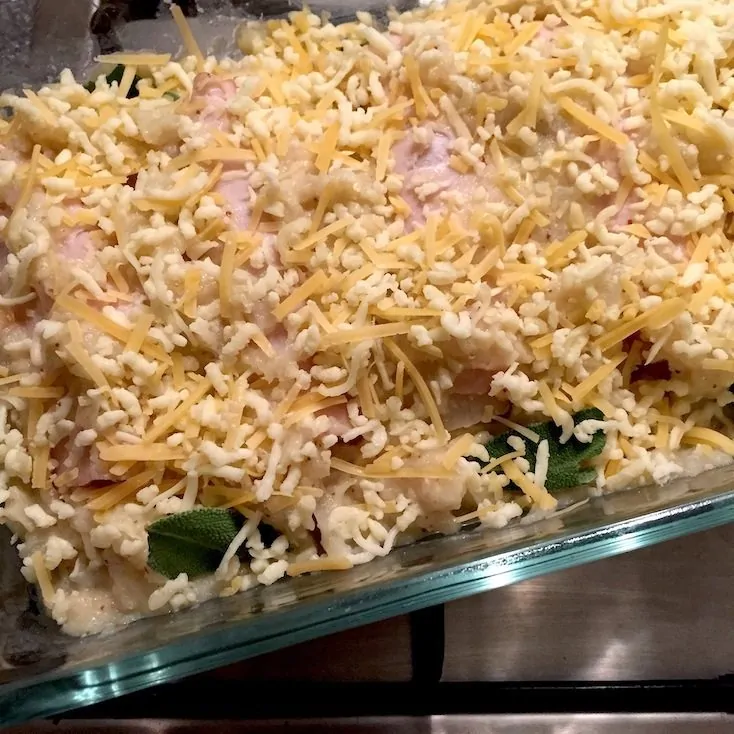 Pak een grote ovenschaal waar straks alle witlof en de puree goed in past en vet deze in, bijvoorbeeld met een dun laagje boter. Rol iedere stronk witlof in 2 plakjes kalkoenfilet en leg deze in de ovenschaal. Verdeel de aardperenpuree er gelijkmatig over en stop vervolgens her en der een blaadje salie tussen de stronken. Niet teveel salie, want anders gaat het overheersen, 8 blaadjes in totaal is voldoende. Maal wat zwarte peper erover en strooi de geraspte kaas over het gerecht.