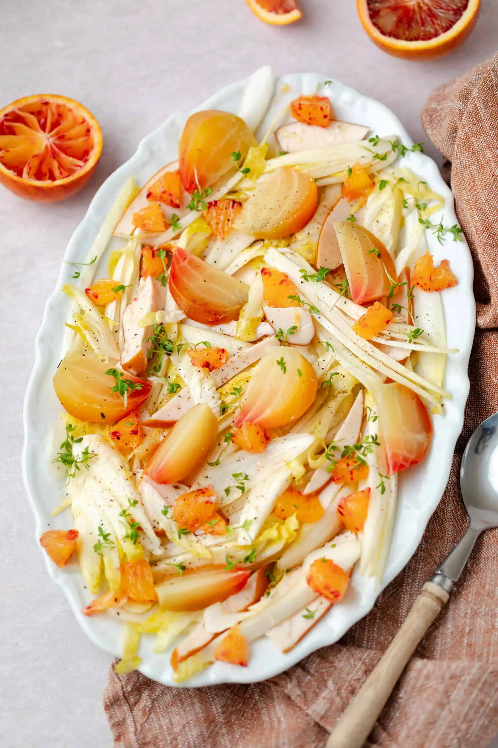Wie mij al wat langer kent, weet dan ik echt geen fan ben van gekookte witlof, maar met rauwe witlof in een salade maak je me helemaal blij. Dus ik dacht eens gek te doen: vandaag komt er gewoon een witlofsalade bij op mijn blog! En wat voor een. Deze witlofsalade met gerookte kip, biet, sinaasappel en tuinkers is niet alleen een plaatje om te zien, maar ook nog eens zalig om te eten.