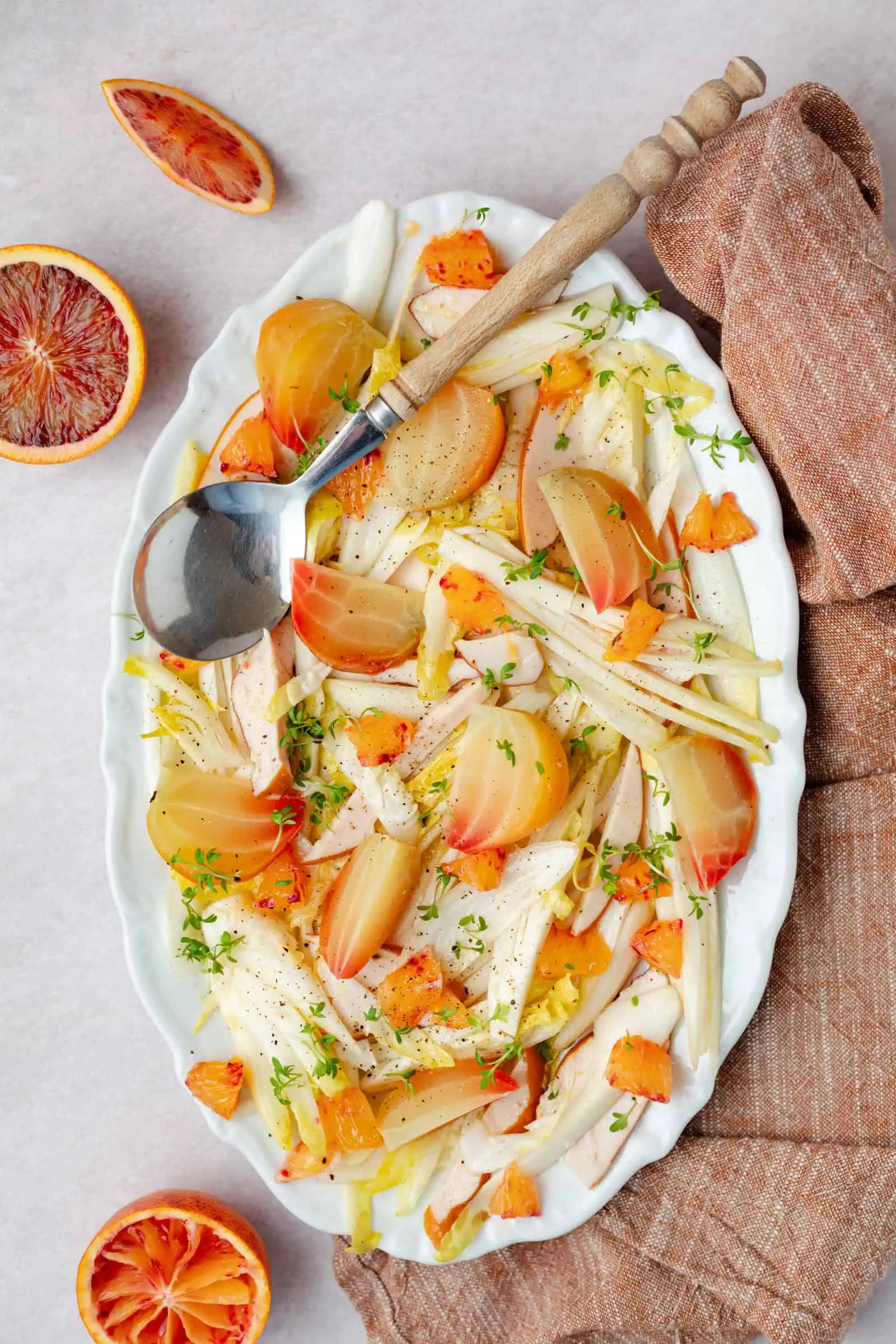 - Verdeel de aangemaakte witlof over een groot bord en garneer je witlofsalade met partjes biet en (bloed)sinaasappel, de walnoten, tuinkers en nog een snufje gemalen zwarte peper.
