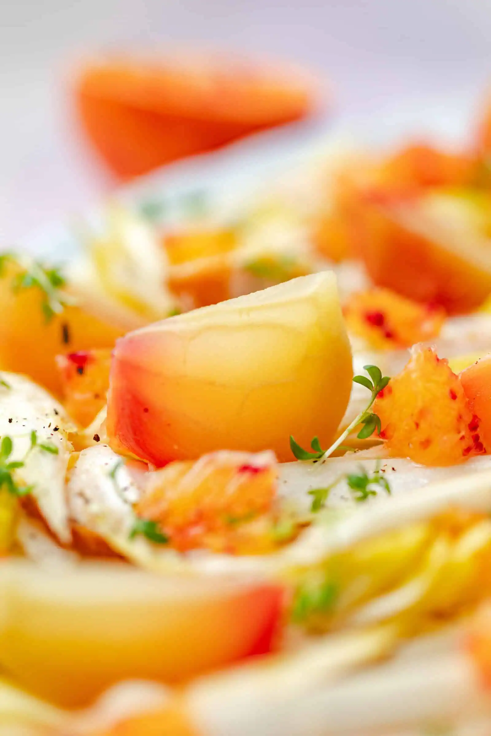 De oplettende kijker ziet dat ik bloedsinaasappel heb gebruikt in de salade. Ten tijde van de fotografie waren die nog in het seizoen en nu niet meer. Maar in plaats van bloedsinaasappel kun je uiteraard ook gewone sinaasappel gebruiken.