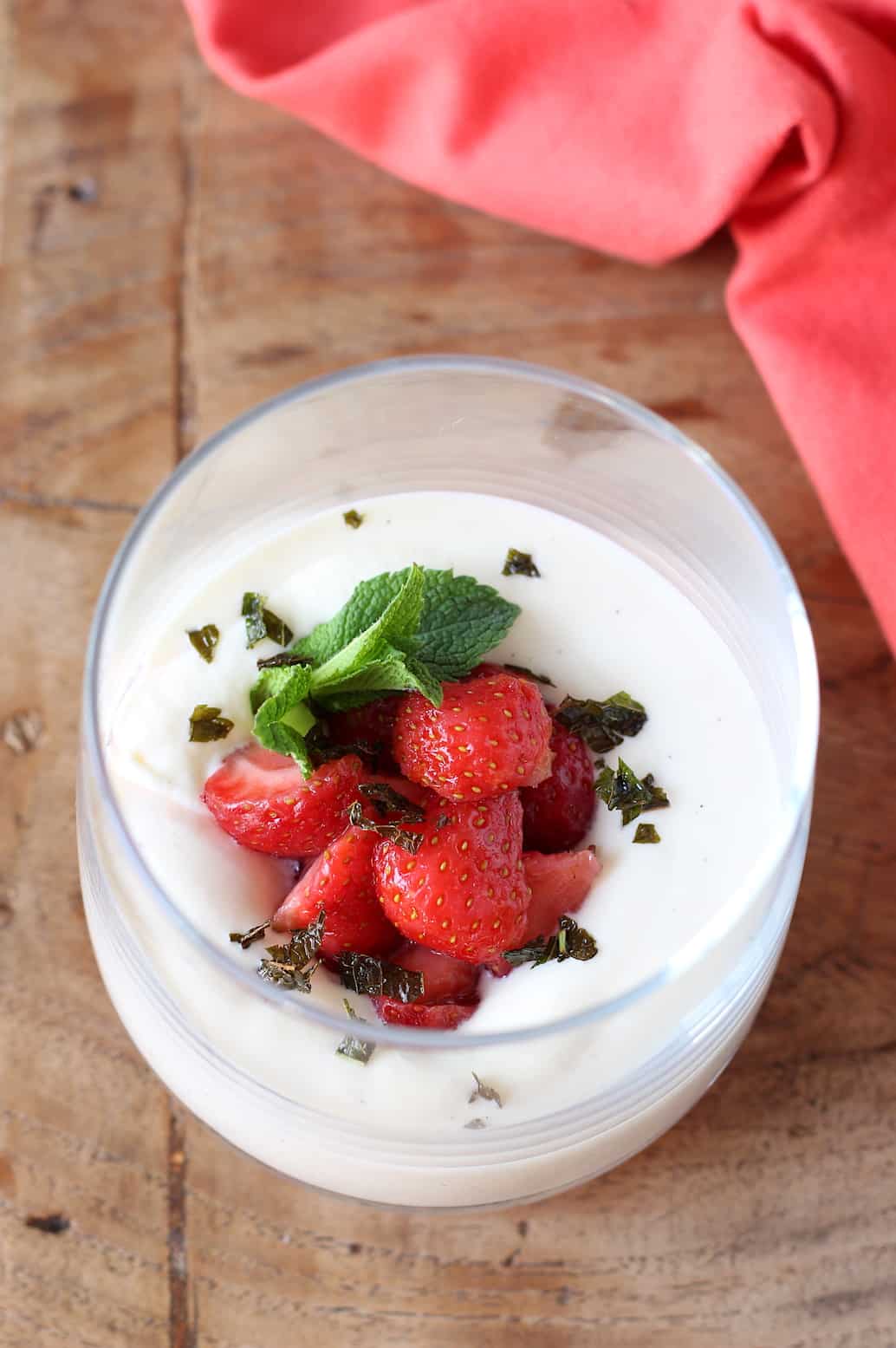 8. Serveer de witte chocolademousse in een mooi glas met wat gemarineerde aardbeien en gefrituurde munt. Of maak een quenelle (ovaal vormpje) van de witte chocolademousse en serveer die op een bordje met de aardbeien en gefrituurde munt.
