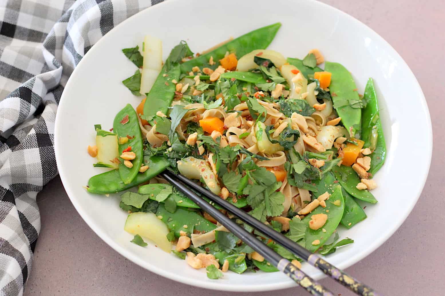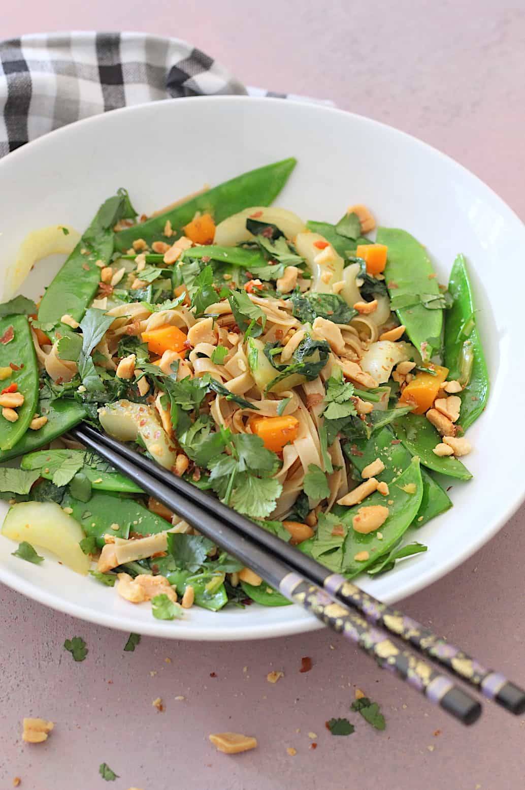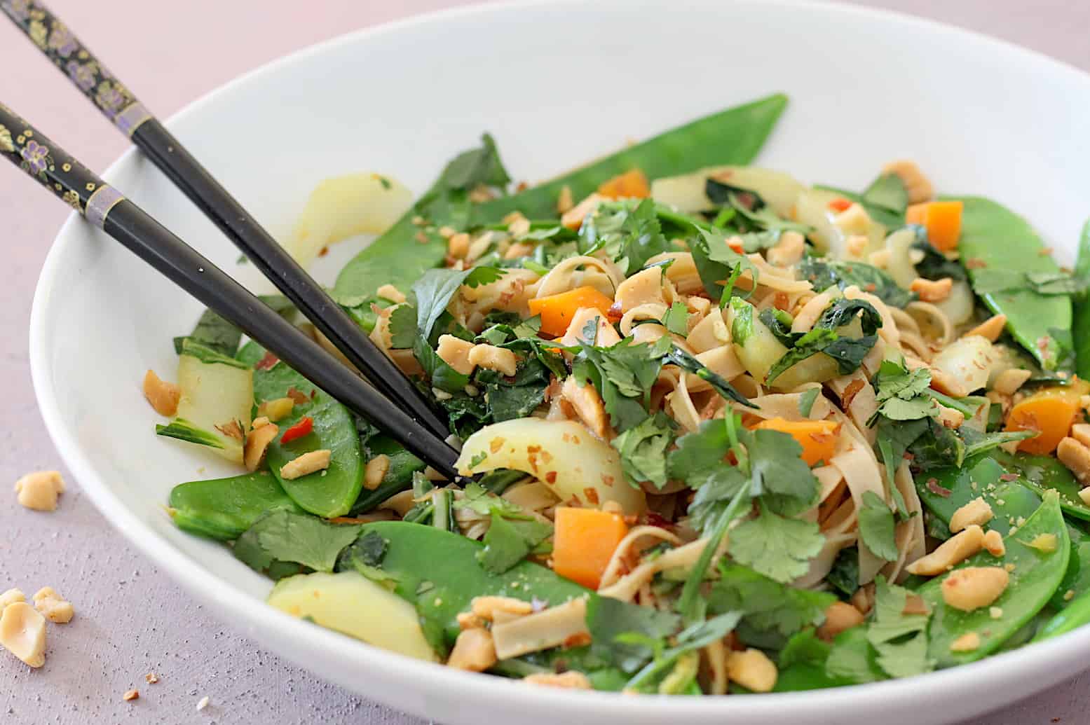 - Serveer de noedels met groenten op borden en garneer royaal met gehakte pinda’s en koriander. Serveer direct.