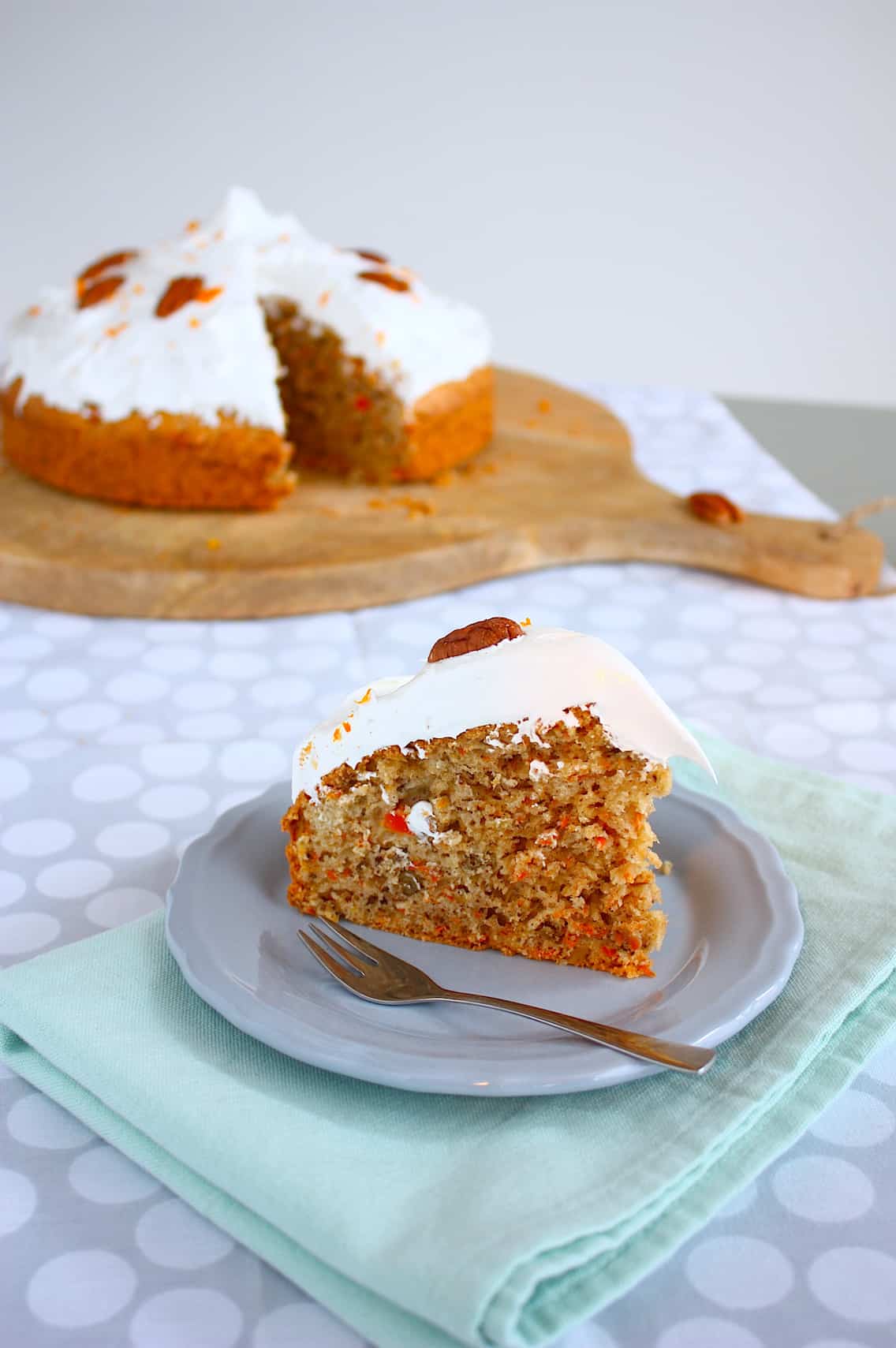 8. Smeer de meringue over de worteltaart met een spatel en garneer met walnoten/pecannoten en wat geraspte sinaasappelschil.