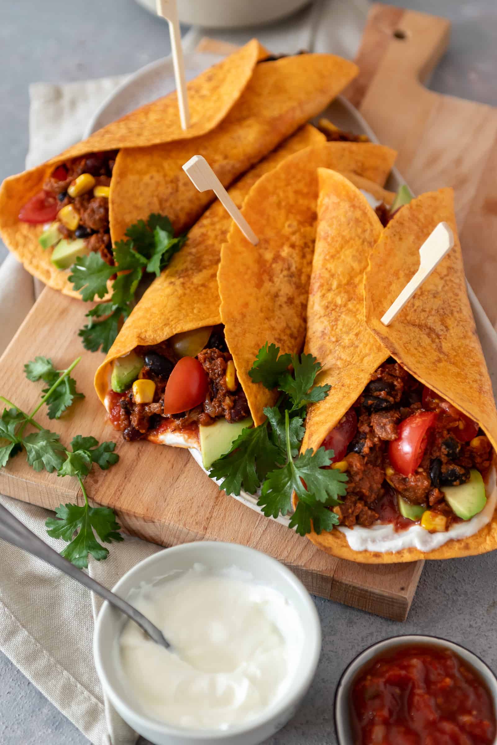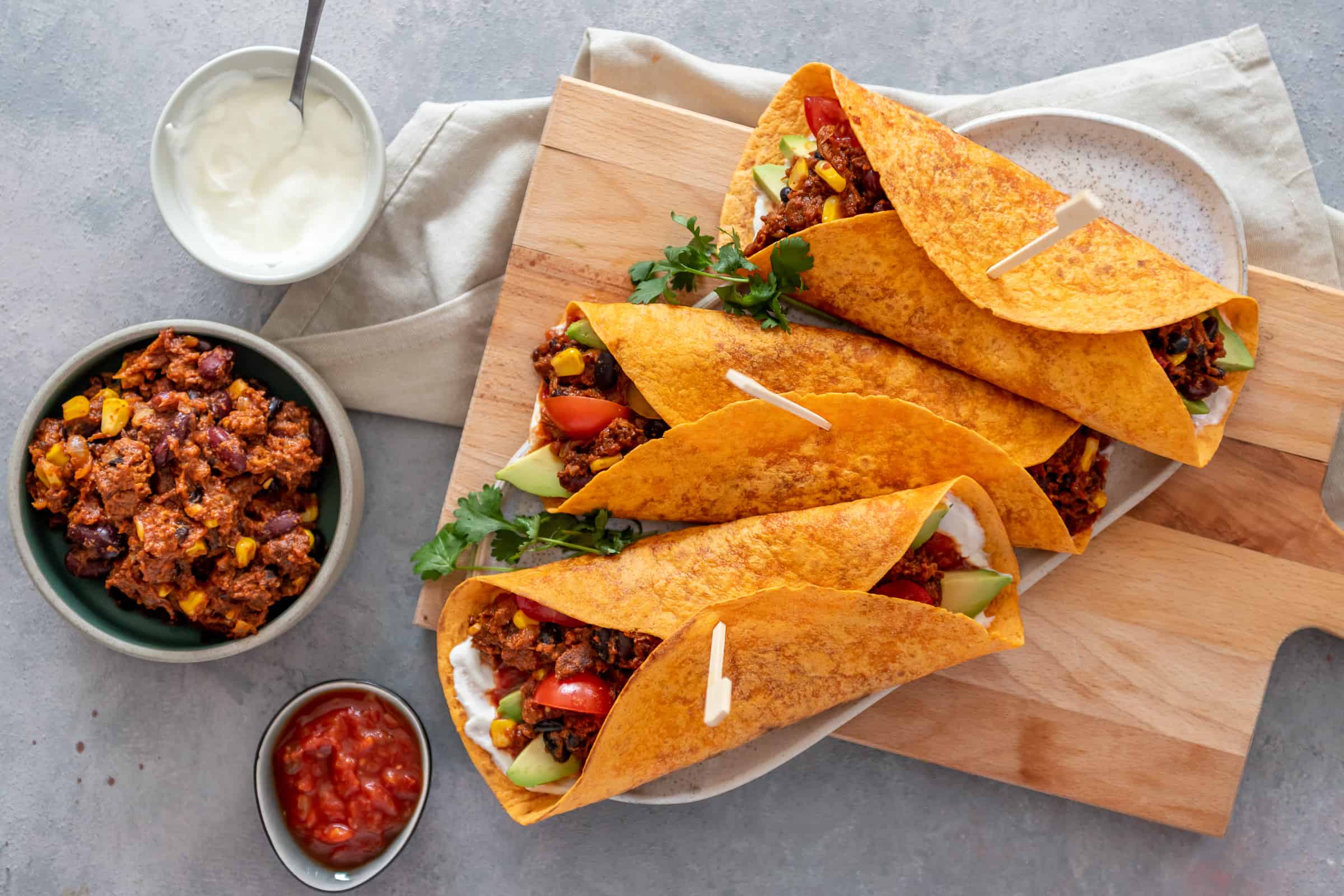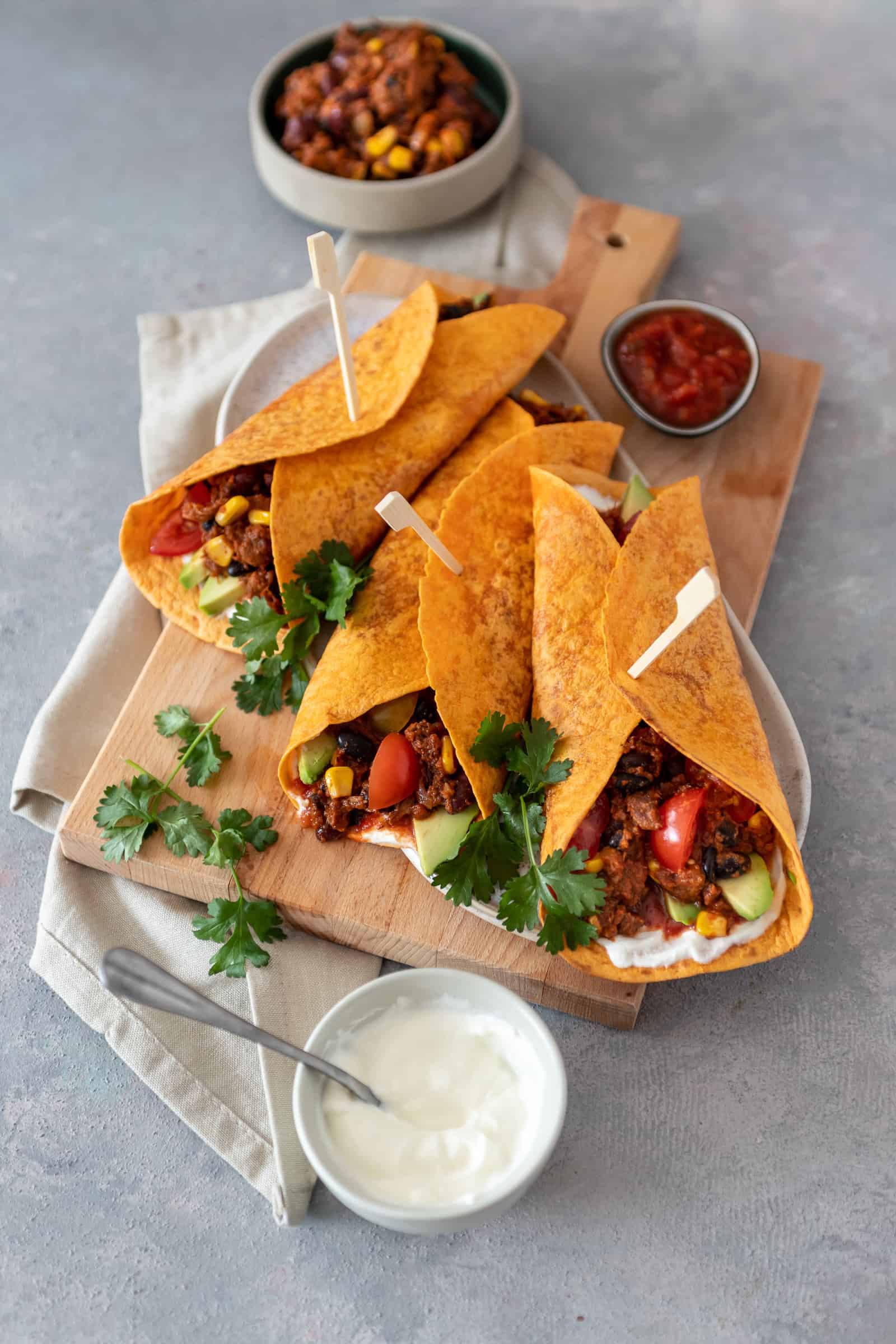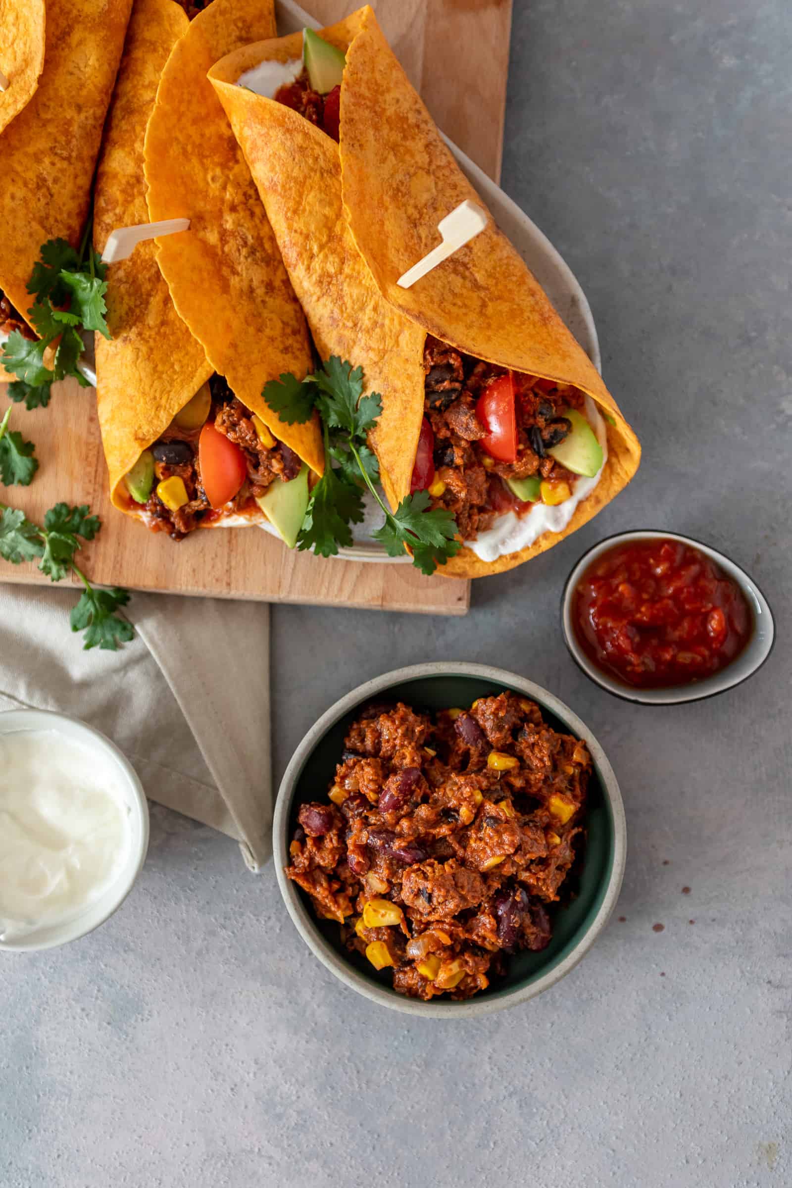- Smeer een laagje zure room op de wrap en beleg met de vegan chili, cherrytomaten, avocado en koriander. Klap of vouw ‘m dicht en serveer direct. Zet ook bakjes met (vegan) zure room en salsa op tafel voor de liefhebbers.