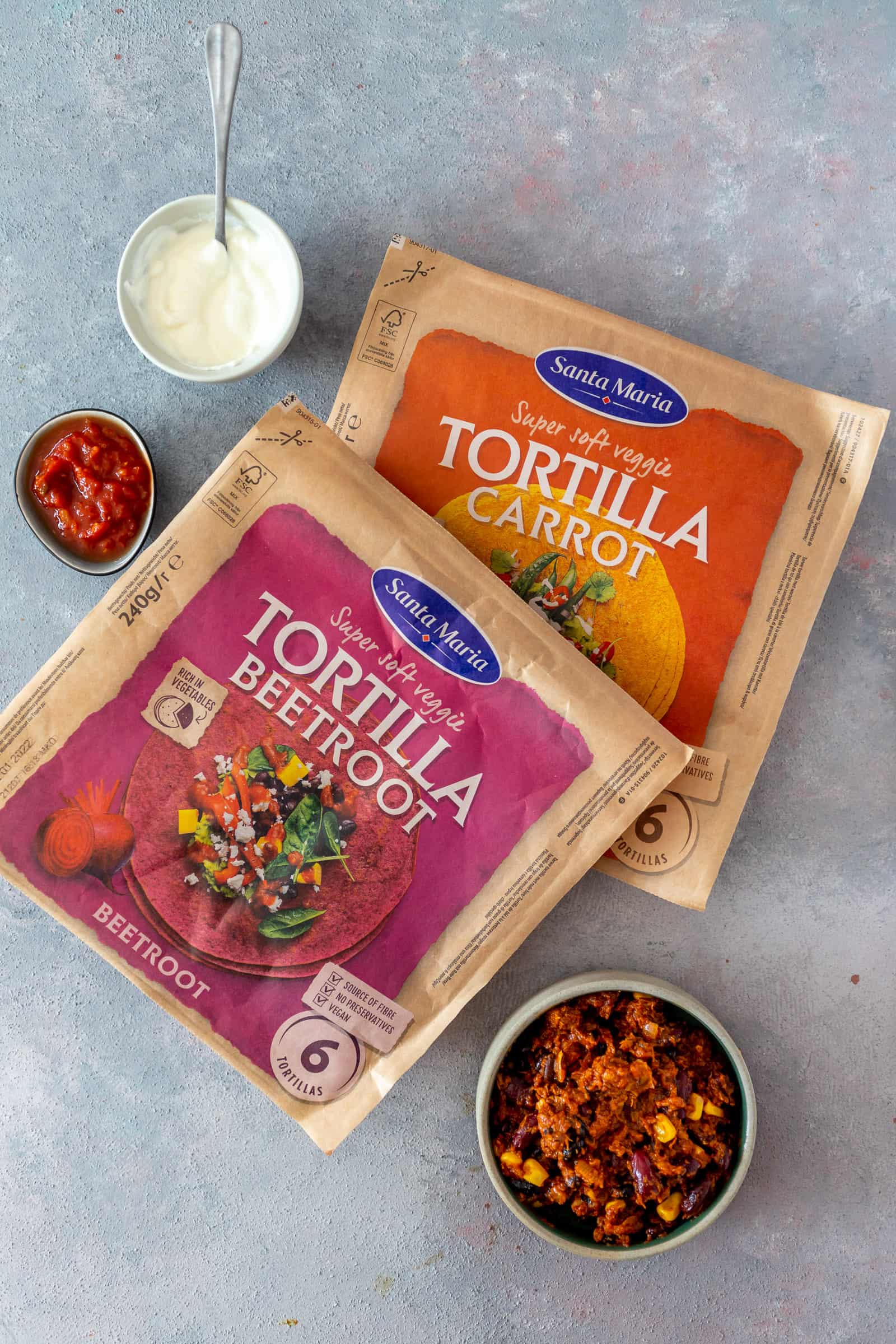 Stiekem had ik er al op gehoopt, maar nu zijn ze er dan ook echt: Santa Maria heeft nu ook groente tortilla wraps in het assortiment en dat vind ik te gek! Je vindt ze in het Tex Mex schap (naast de gewone tortilla wraps), ze zijn er in de smaken wortel en biet, zijn lang houdbaar, vegan en bestaan voor een derde uit groenten.