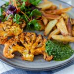 Een heerlijke bloemkoolsteak, gebakken in een grillpan en geserveerd met salsa, aardappel wedges uit de oven en een frisse salade.