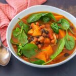 Een spannende variant voor liefhebbers van bonensoepen: een vegan bonensoep met geroosterde pompoen, currypasta en spinazie.