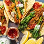 Heerlijk makkelijk Tex Mex gerecht voor doordeweeks: deze fajita's met aubergine, bimi, salsa en zure room heb je binnen no time op tafel staan.