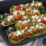 Deze heerlijke gevulde courgette met couscous, doperwten en cherrytomaten heb je binnen 25 minuten in de oven staan.