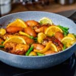 Zet het vuur uit onder de hapjespan en vis het bosje kruiden eruit. Halveer de plakjes sinaasappel en citroen, die je in het begin hebt gesneden, en steek deze tussen je ingrediënten in de pan. Strooi er nog een snufje zwarte peper en wat fijngehakte kruiden over. Eet smakelijk!