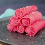 Zodra de vulling is afgekoeld kun je gaan vullen. Leg een flensje met de mooi roze kant naar beneden en snijd daarna doormidden. Leg een reep van de vulling op de lange kant van het flensje. Rol daarna het flensje vanaf de lange kant op. Snijd eventueel de zijkantjes eraf zodat je een mooi strak kokosflensje krijgt. Die zijkantjes eet ik meestal gelijk op, maar dat terzijde ;-).