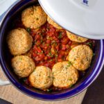 Deze heerlijke groentestoof met harissa zit bomvol groenten en kikkererwten. De zelfgemaakte kaas-bieslookbroodjes gaar je in de oven. Zalig!