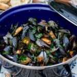 Maak in de tussentijd de mosselen schoon. Spoel ze goed af onder stromend water en gooi alle schelpen die beschadigd zijn of niet meer dicht gaan weg.