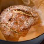 Haal, voorzichtig, de bloedhete pan uit de oven en zet ‘m op een rekje. Haal het deksel eraf en leg die op het tweede rekje. Verwijder de theedoek van je brood en til het brood met bakpapier en al op. Laat het voorzichtig in de pan zakken (nog steeds met het bakpapier) en zet het deksel (met ovenhandschoen) weer op de pan.