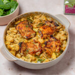 Schep het mengsel over in een ovenschaal. Leg de kippendijen bovenop en duw ze iets in de saus.