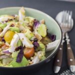 Snijd de gerookte kipfilet in plakjes of blokjes en doe deze samen met de sla in een schaal. Snijd de avocado in blokjes en halveer de cherrytomaten. Voeg dit toe aan de sla.