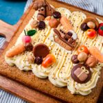 Zodra de plaatcake is afgekoeld leg je ‘m op een plank of schaal. Maak mooie toeven of banen met je spuitzak en daarna begint het leukste klusje! Roep de kinderen er maar bij, of misschien zijn ze er al druk mee bezig, en laat ze lekker hun gang gaan.