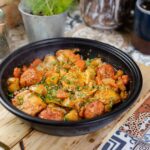 Doe de gesnipperde ui in de tajine samen met je specerijenblend. Fruit dit een paar minuten met de deksel gesloten. Schep daarna de aardappel, wortel en knoflook erdoor en bak nog een paar minuten mee.