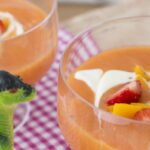 Giet het toetsoepje in 4 diepe borden of kommen. Giet in het midden van de soep een eetlepel yoghurt en leg daarop de stukjes aardbei en mango die je achtergehouden hebt. Snijd de munt in dunne reepjes en strooi die naar smaak over het soepje.