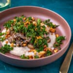 Van de inhoud van een pot witte bonen maak je in een handomdraai een romige witte bonenpuree. In dit gerecht gecombineerd met paddenstoelen, sojasaus, kruidige roergebakken boerenkool en cashewkruim.