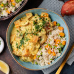 Deze milde, romige zoete aardappel curry met kip is heel rijk van smaak en wordt geserveerd met zilvervliesrijst met extra groenten.