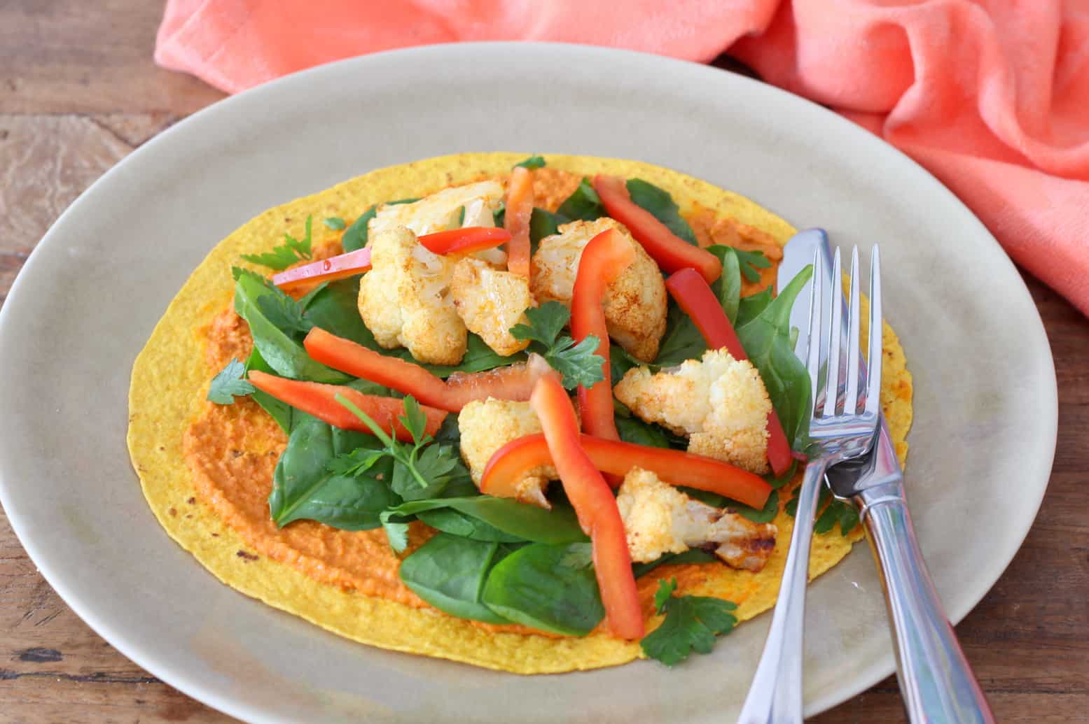 Vorige week kregen jullie van mij al het recept van de paprikahummus. Die smaakt gewoon zo, met brood of naan, uit het bakje al heerlijk. Maar je kunt er ook heerlijke wraps met paprikahummus, geroosterde bloemkool en spinazie mee maken! Lekker als lunch bijvoorbeeld. En omdat je de onderdelen (na bereiding) kunt bewaren in de koelkast is het ook nog eens een makkelijk gerecht om voor te bereiden in de avond of in het weekend.