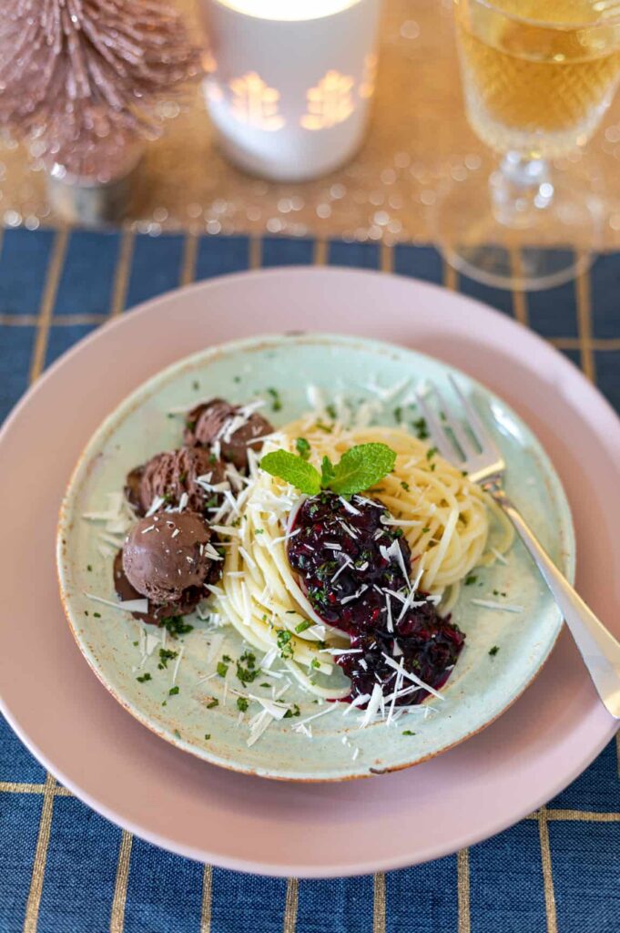 Ik ben niet vaak besluiteloos, maar met het dessert van mijn kerstmenu dit jaar gedroeg ik me als een echte weegschaal: want ik kon niet kiezen. Aan de ene kant had ik een yoghurt panna cotta met amandel en ananas, maar ook een heerlijke dessert pasta met rood fruit compote, chocolade ijs, geschaafde witte chocolade en munt.