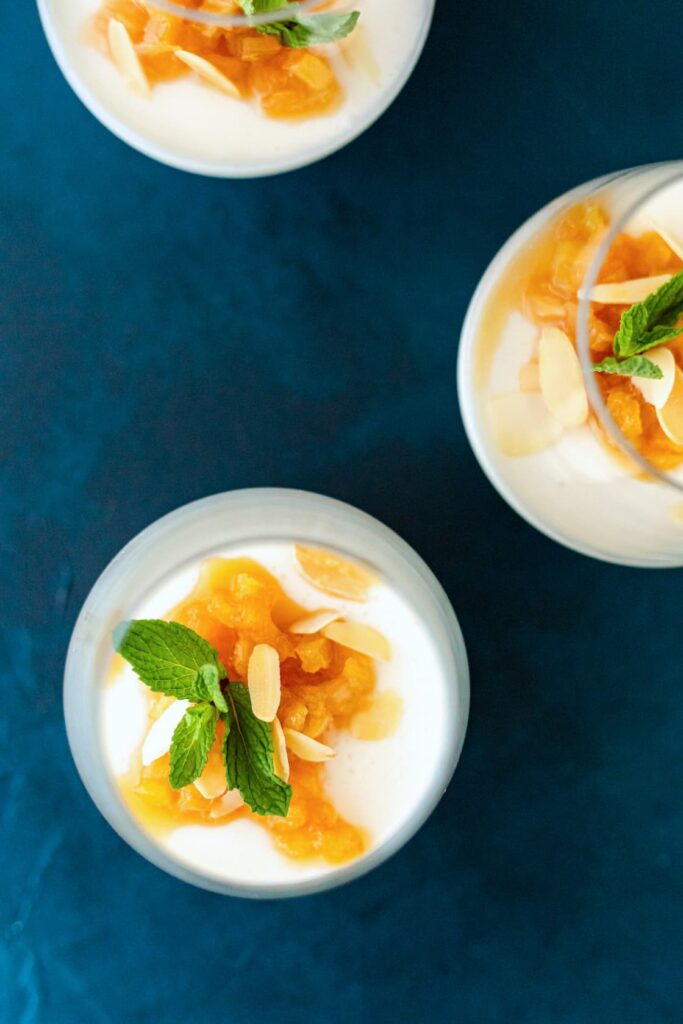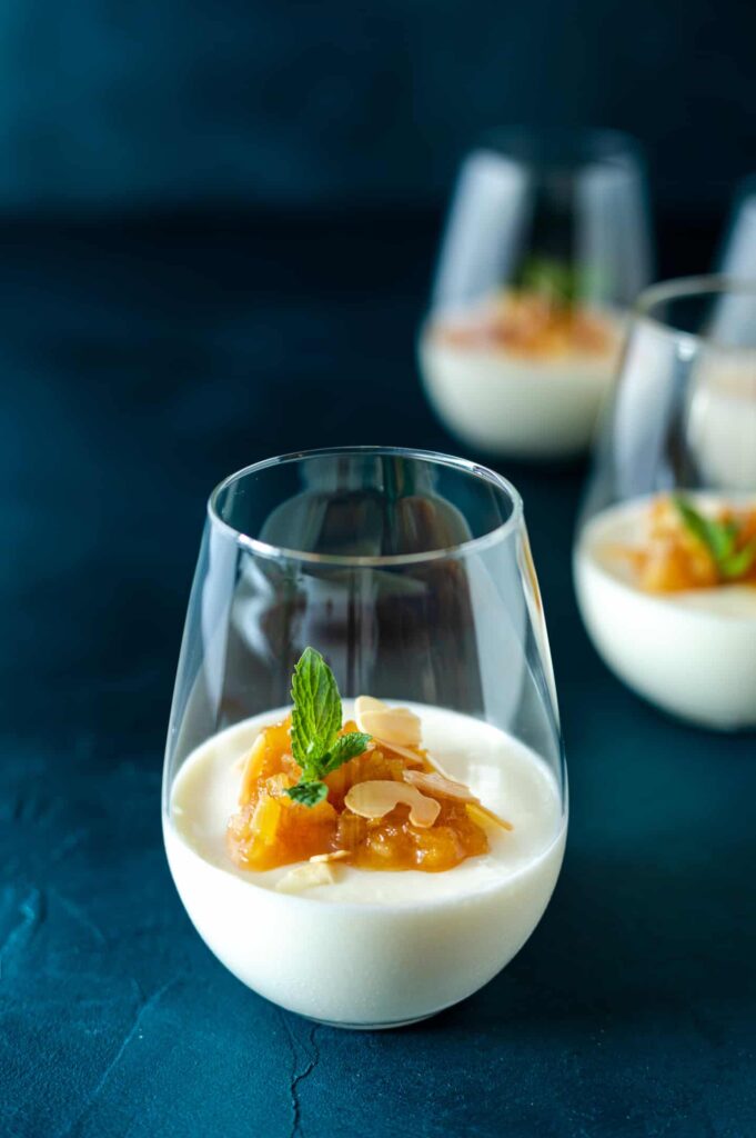 Yoghurt panna cotta met amandel, munt en gekaramelliseerde ananas