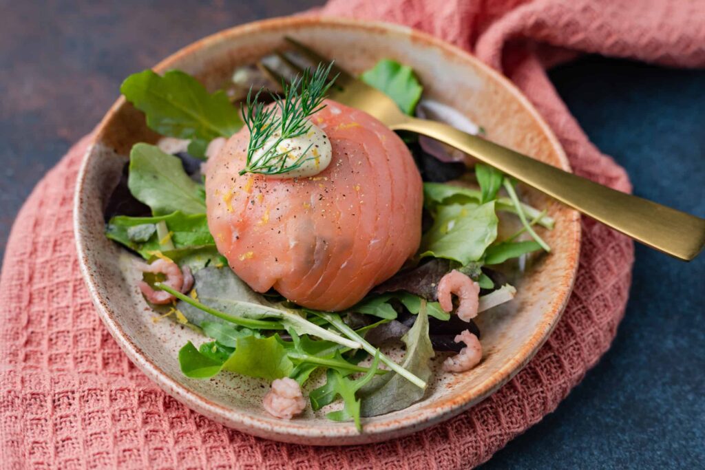 Zalmbonbon met garnalen, appel en koffiemayonaise