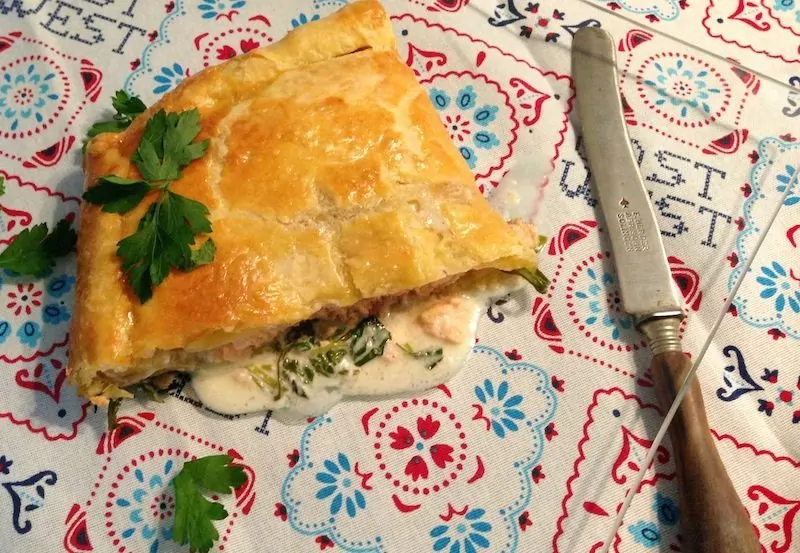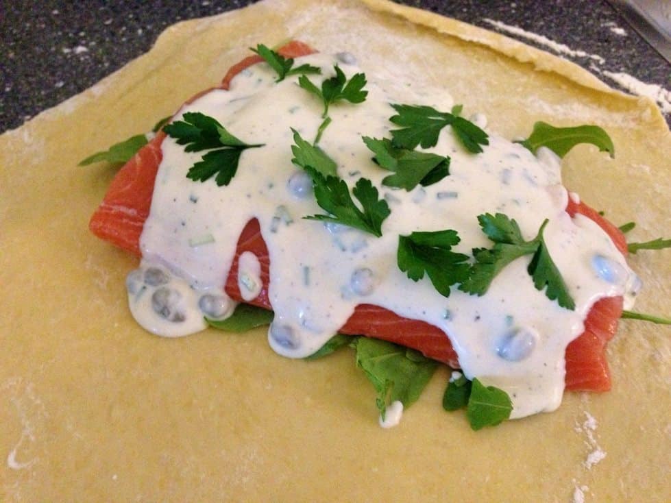 Je gaat vervolgens de helft van 1 plak beleggen en de andere helft sla je er daarna overheen. Neem een handvol rucola en leg die op de helft van een plak. Verdeel daar een eetlepel van het mengsel over. Leg daar vervolgens de zalmfilet op en strijk daar weer een volle eetlepel van het mengsel over. Leg 2 takjes peterselie daarop en pak daarna de pastei in met de andere helft van het deeg. Druk de randjes van het deeg goed op elkaar met vochtige vingers. Of rol de randjes op en druk ze daarna iets in met de tanden van een vork.