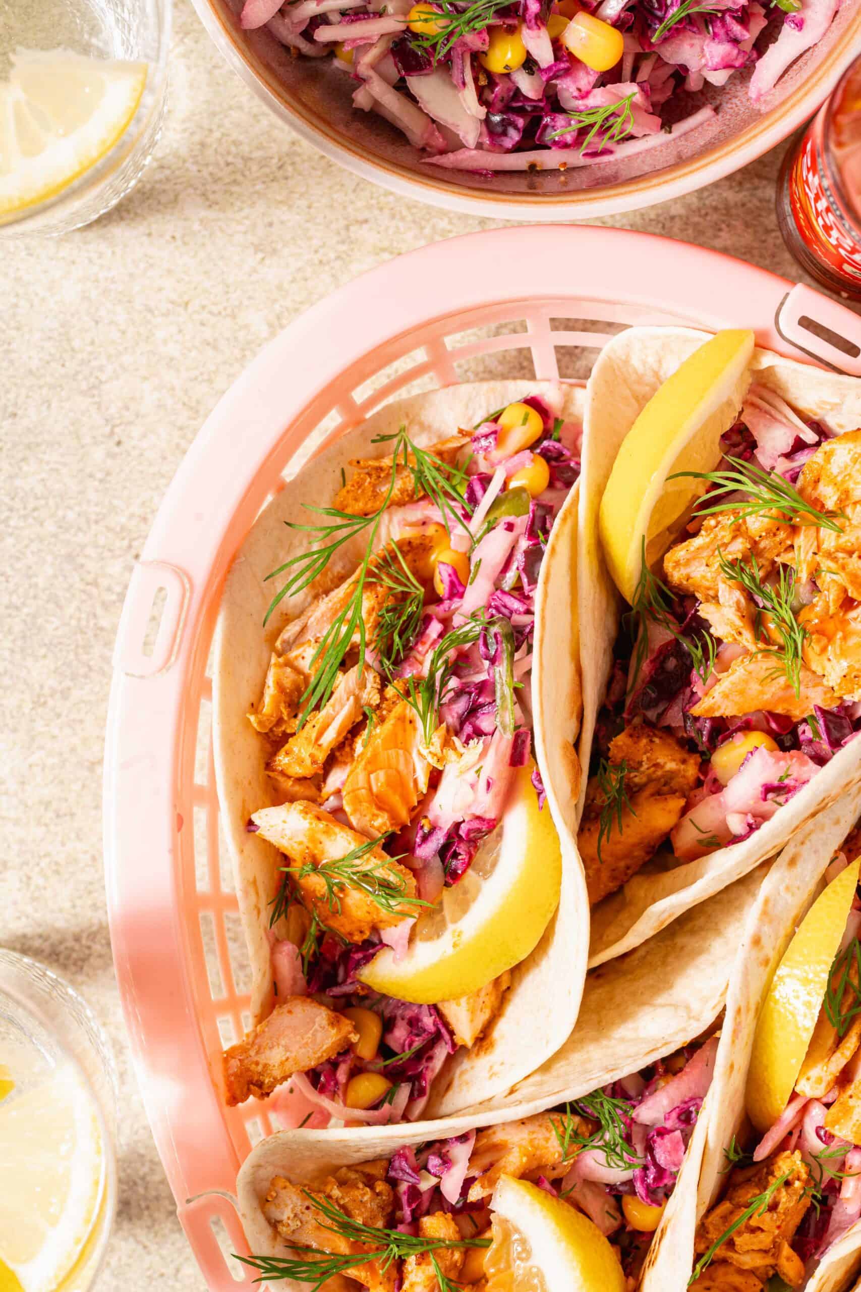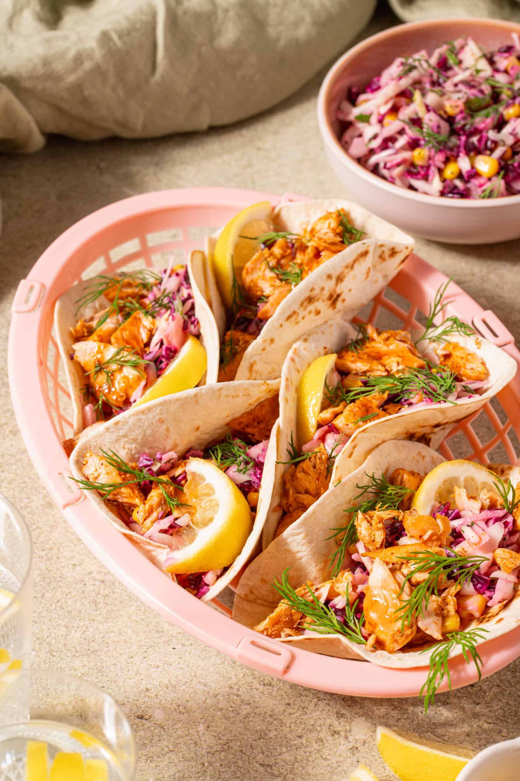 Zalmtaco’s met koolsalade, citroen en dille