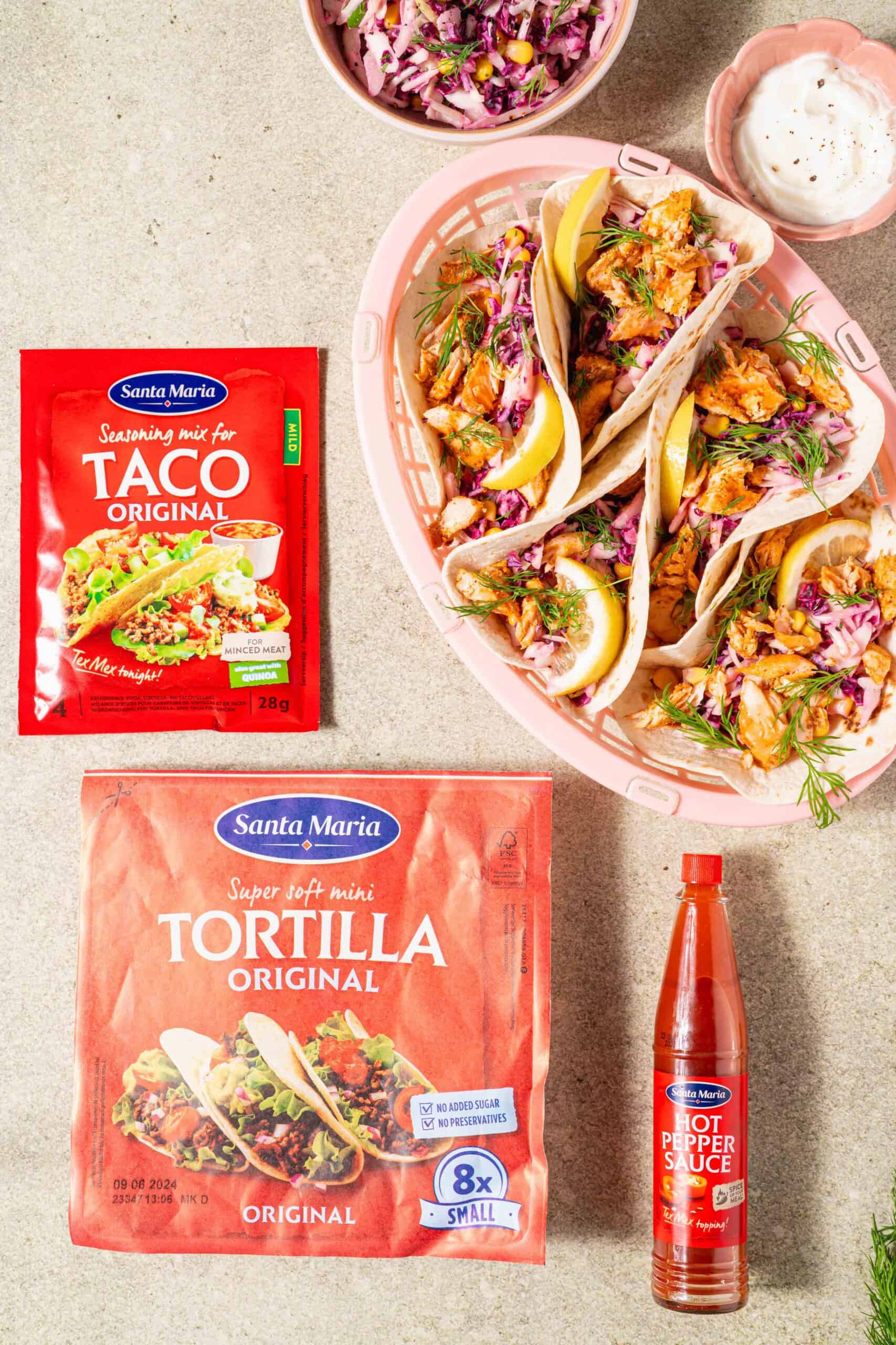 • Je kunt de zalm ook marineren met de Taco Seasoning Mix waar geen zout en suiker aan is toegevoegd. Deze vind je in het Santa Maria schap en je herkent ‘m aan de blauwe band op het zakje. Ik zou hier nog wel wat zout aan toevoegen, maar de hoeveelheid bepaal je dan zelf.