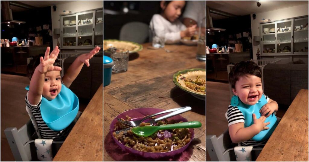 En de avondmaaltijden? Zoals ik aangaf in de introductie, hij eet al bijna volledig met ons mee en wordt het meest blij van alles wat Surinaams is. Nasi, saoto en bruine bonen zijn de lievelingsmaaltjes, het zit in de genen 😉