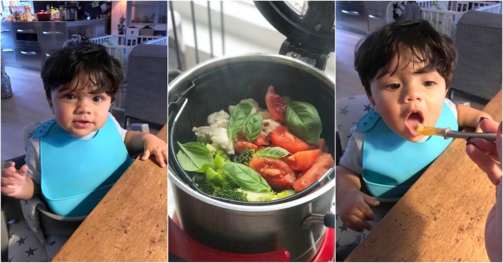 Tijd om ‘echt’ te gaan eten! Oftewel: 1 fles geschrapt en de avondmaaltijd geïntroduceerd. Veelal (mini) maaltijden waarbij groenten de basis waren en die vulde ik aan met rijst, bulgur, couscous of aardappel. Soms kwam daar ook nog vis en vlees bij. Zijn maaltijden waren enorm divers. Denk aan een knolselderijstamppotje met doperwten en witvis, rijst met wortel, tomaat, basilicum en kip of deze risotto met bietjes bijvoorbeeld. Ik maakte af en toe nog een klein voorraadje in het weekend, maar ik gebruikte steeds vaker de ingrediënten die ik ook voor onze eigen maaltijden gebruikte. Terwijl ik dan in de pannen stond te roeren, deed ik de ingrediënten die over waren in de stoompan en vaak was dat voldoende voor minimaal 3 dagen. Hij was in deze fase ook dol op soep! Groentesoep met rijst bijvoorbeeld. Dat ging erin als koek, euh, soep 😉