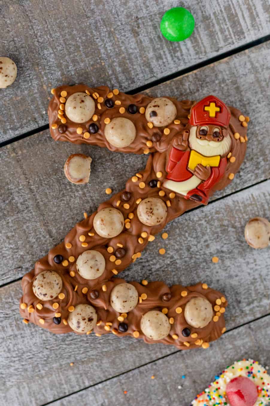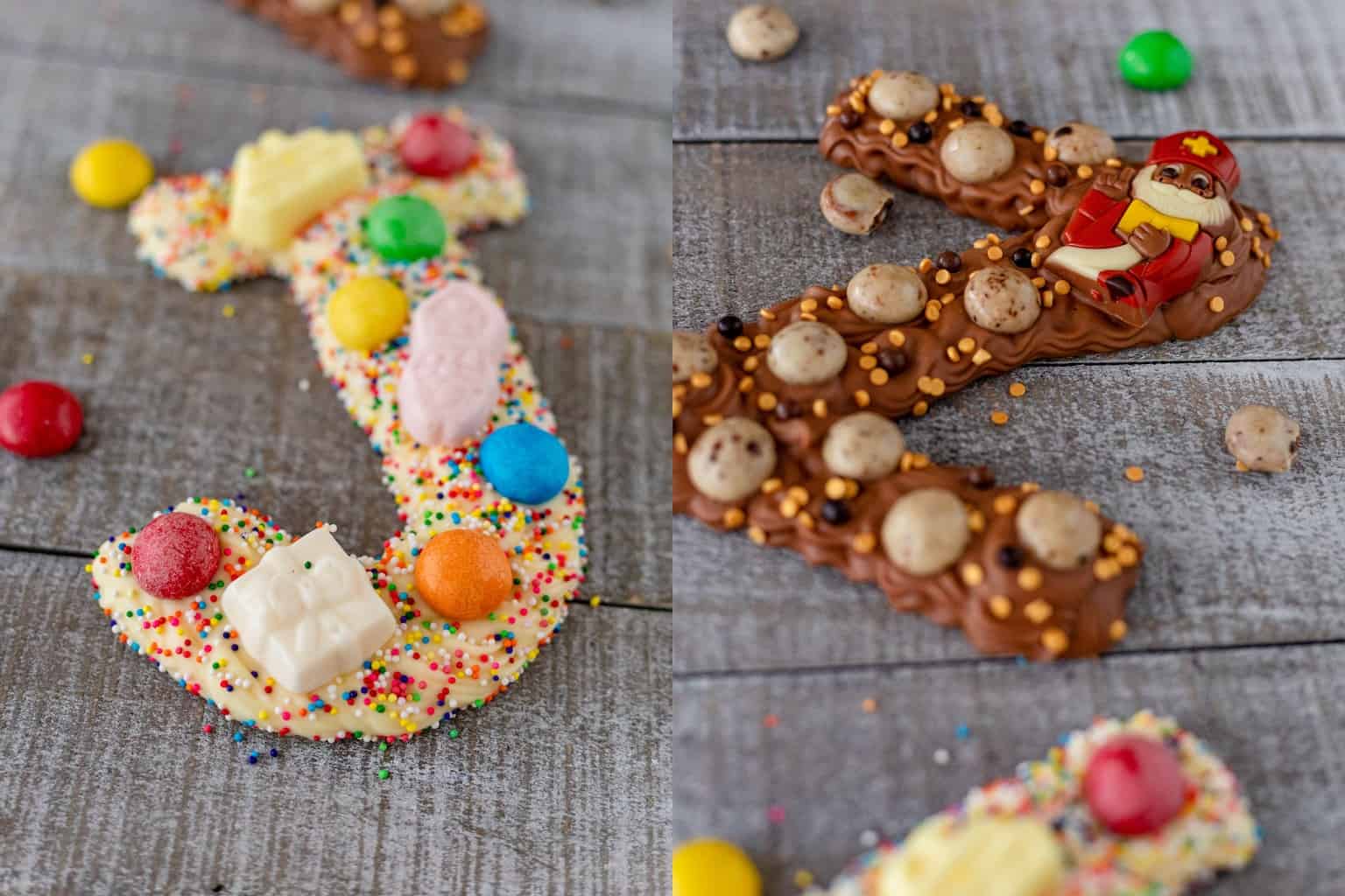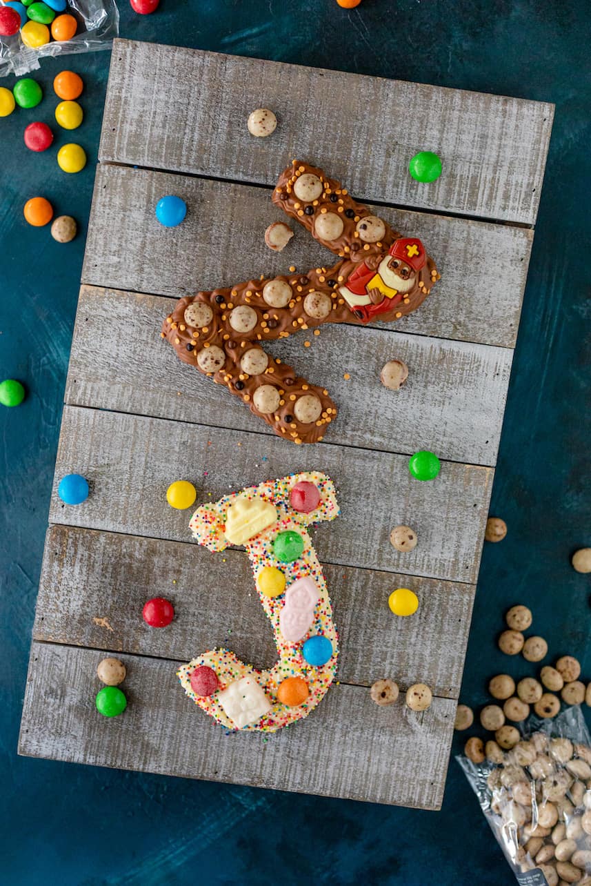 - Daarna begint het leukste werk: decoreren! En dat kun je zo gek maken als je wilt. Zo ging ik voor een traditionele melkchocoladeletter met cappuccino kruidnoten, chocoladesprinkles en een chocolade sint voor Zayne. En voor Jessey maakte ik een witte discoletter met schuimpjes, vrolijk gekleurde kruidnoten en confetti sprinkles.